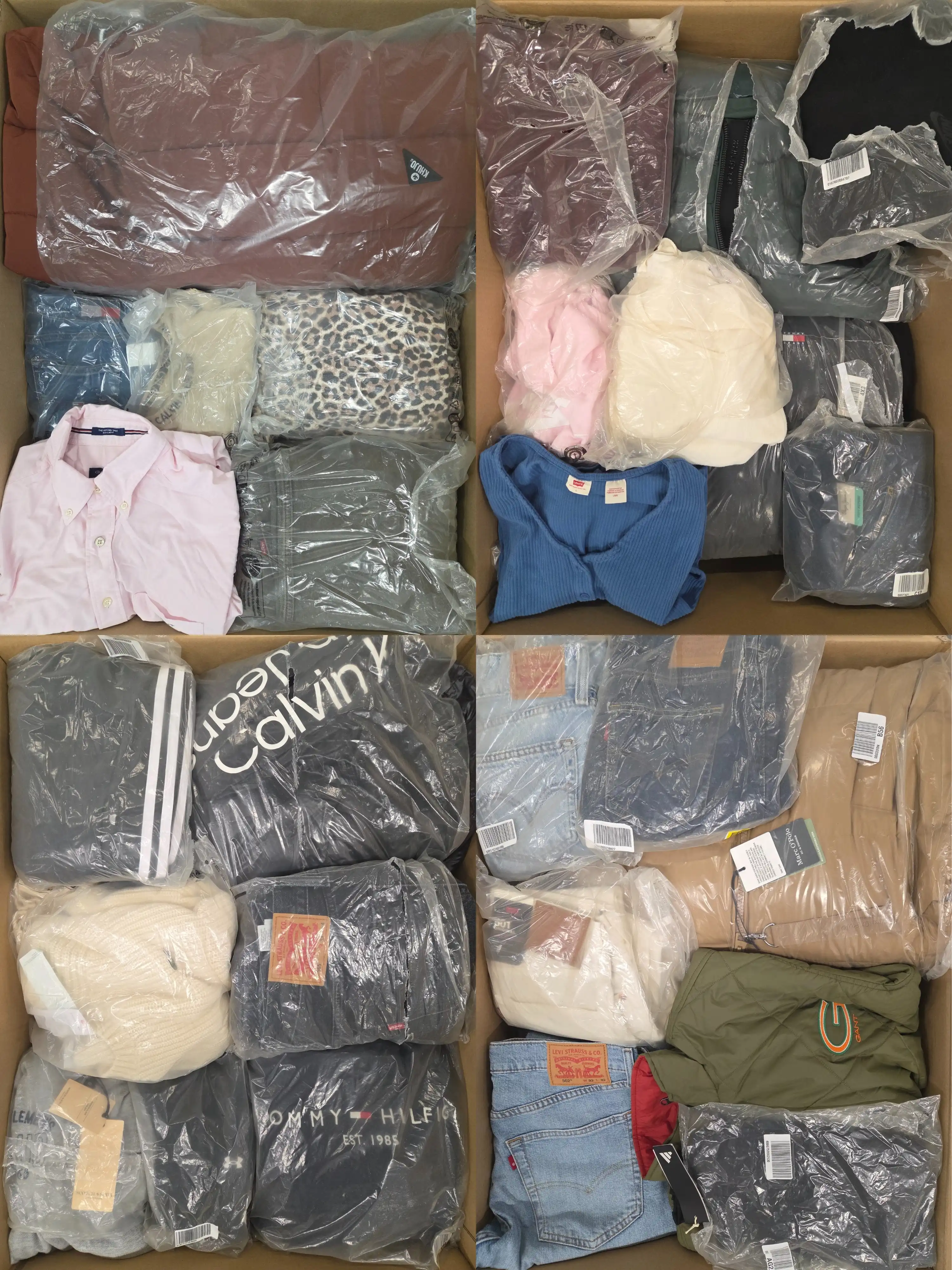 The pallet contains women’s, men’s and children’s clothing across a wide range of categories — from underwear and T-shirts to sweaters, trousers, hoodies, jackets, dresses and swimwear. The garments may exhibit issues such as tears, abrasions, discoloration, stains, broken zippers and other defects, some of which may be repairable, while others remain permanently damaged.