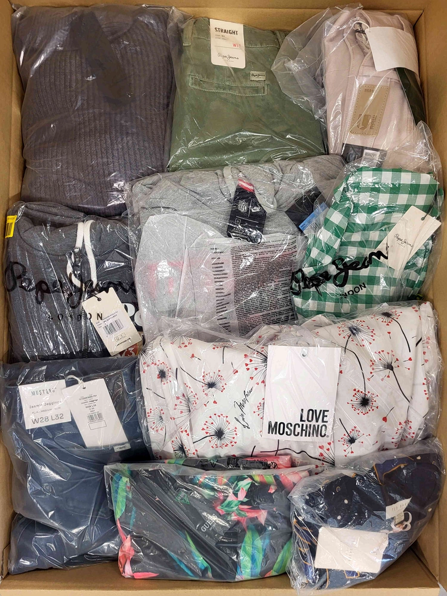 Clothing package containing a mix of brands in quality category A. Approx. 100% of the package with a paper label, and 20-25% are the most recognizable brands. The top layer shown is the contents of this package and represents the best brands.