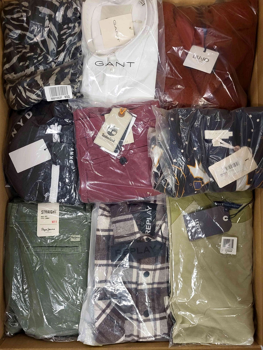 Clothing package containing a mix of brands in quality category A. Approx. 100% of the package with a paper label, and 20-25% are the most recognizable brands. The top layer shown is the contents of this package and represents the best brands.