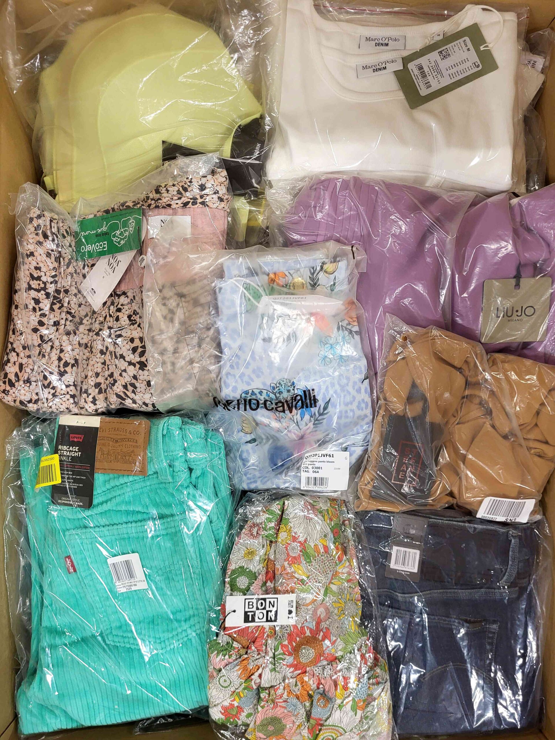 Clothing package containing a mix of brands in quality category A. Approx. 100% of the package with a paper label, and 20-25% are the most recognizable brands. The top layer shown is the contents of this package and represents the best brands.