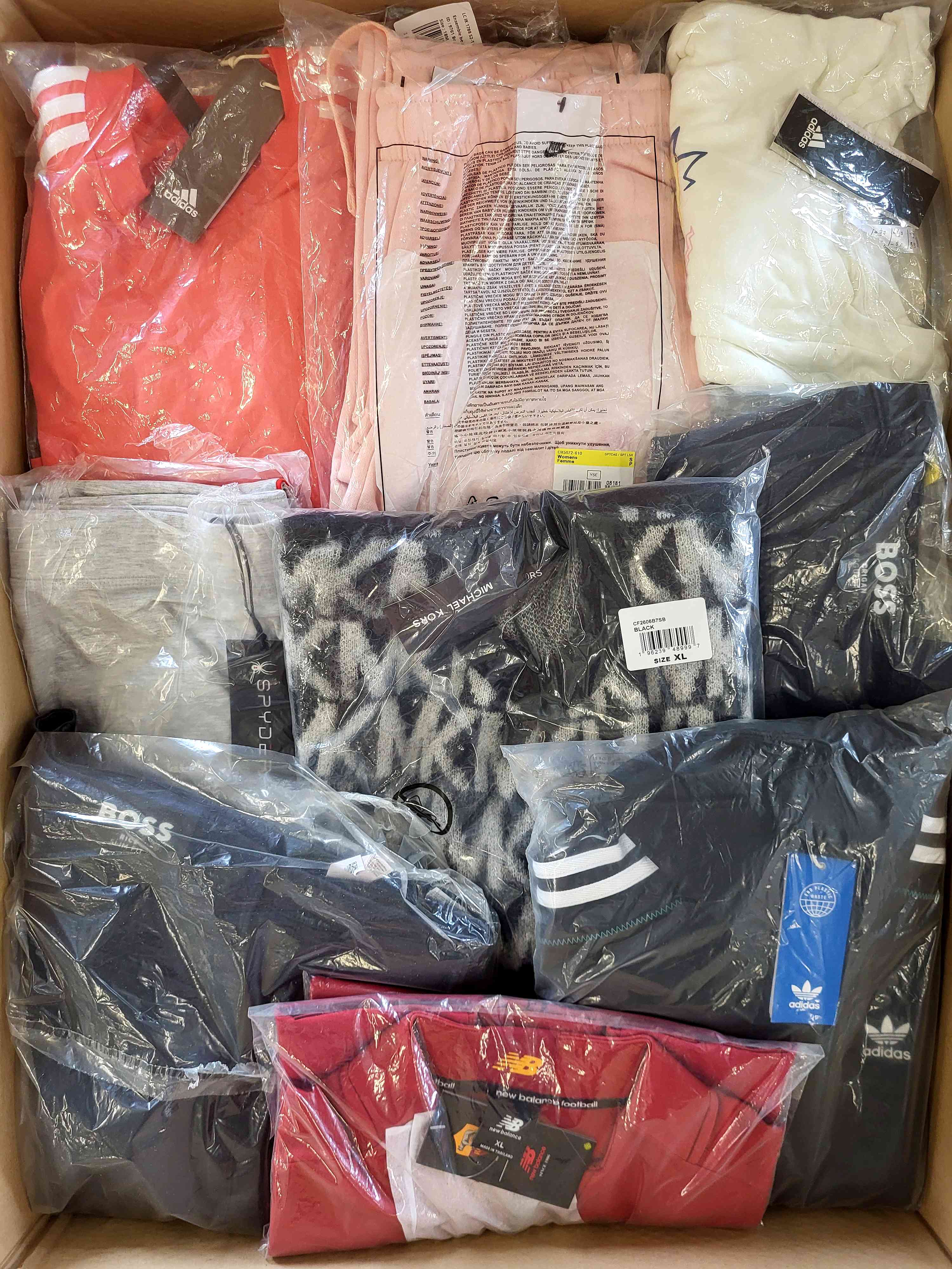 Clothing package containing a mix of brands in quality category A. Approx. 100% of the package with a paper label, and 20-25% are the most recognizable brands. The top layer shown is the contents of this package and represents the best brands.