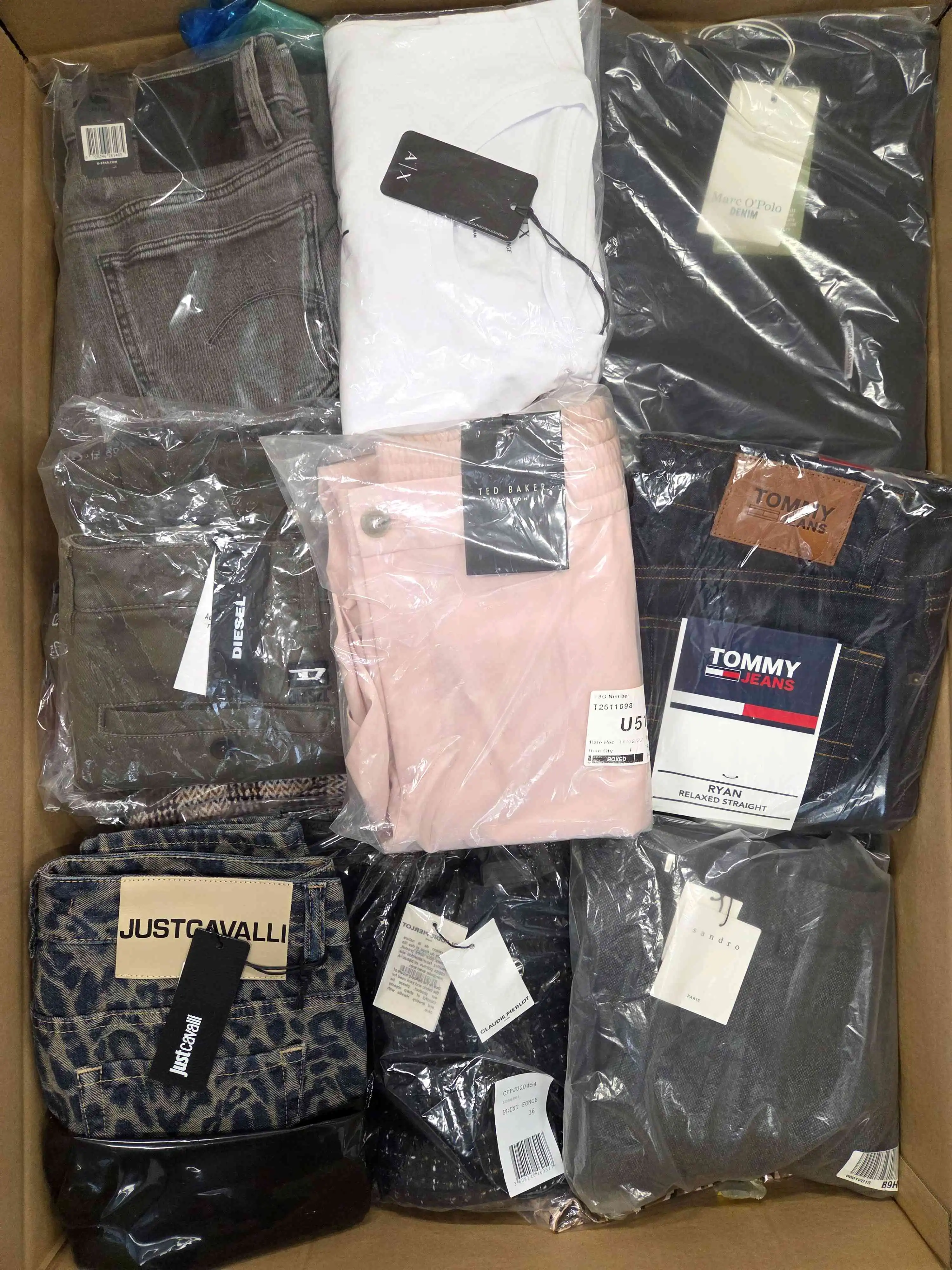 Clothing package containing a mix of brands in quality category A. Approx. 100% of the package with a paper label, and 30-35% are the most recognizable brands. The top layer shown is the contents of this package and represents the best brands.