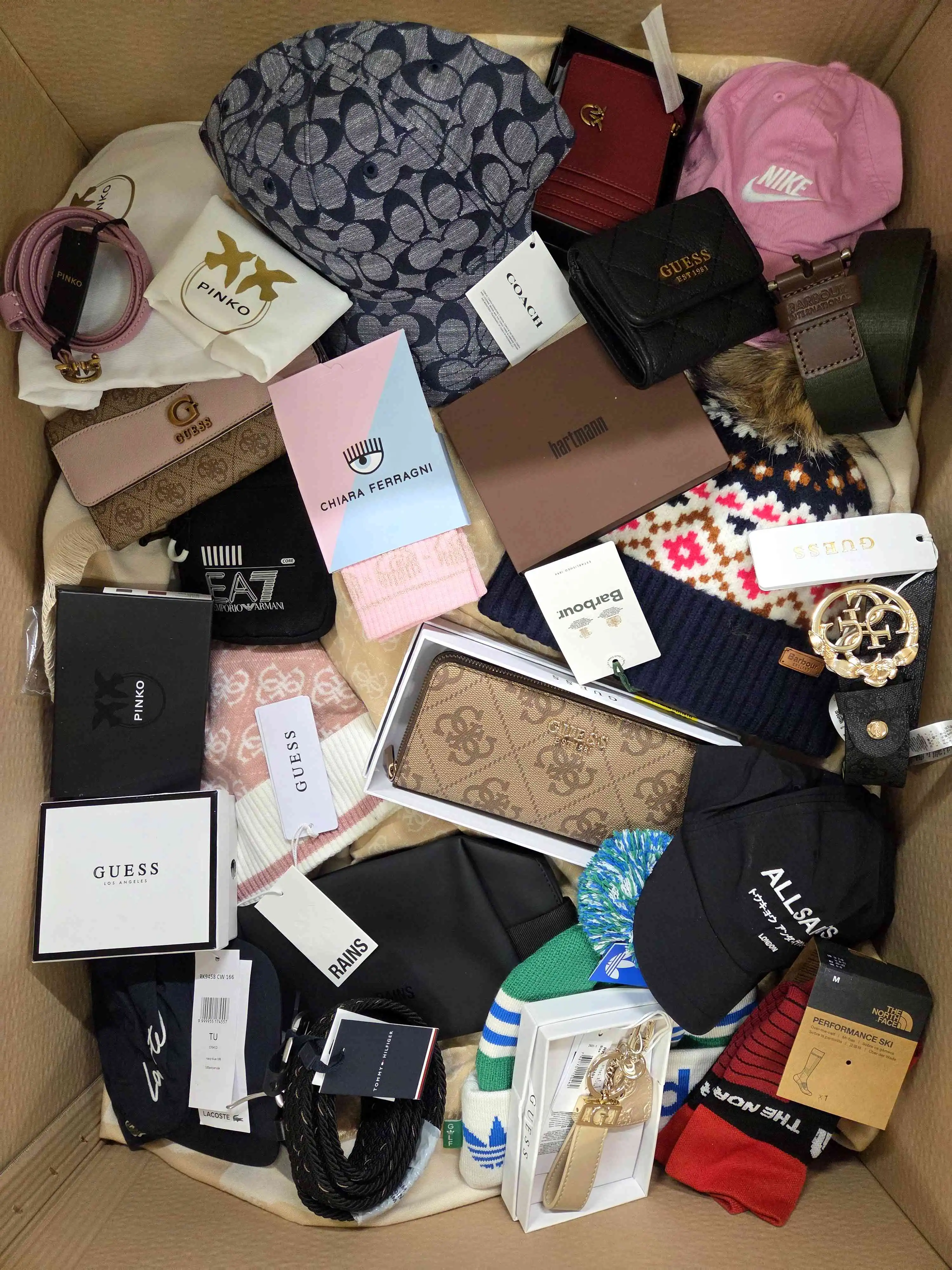 Premium accessories in category C. Inside you will find wallets, belts, scarves, tights, socks, glasses, baseball caps,. Prevalence of winter hats, scarves, gloves . There are 70 pieces in the package.