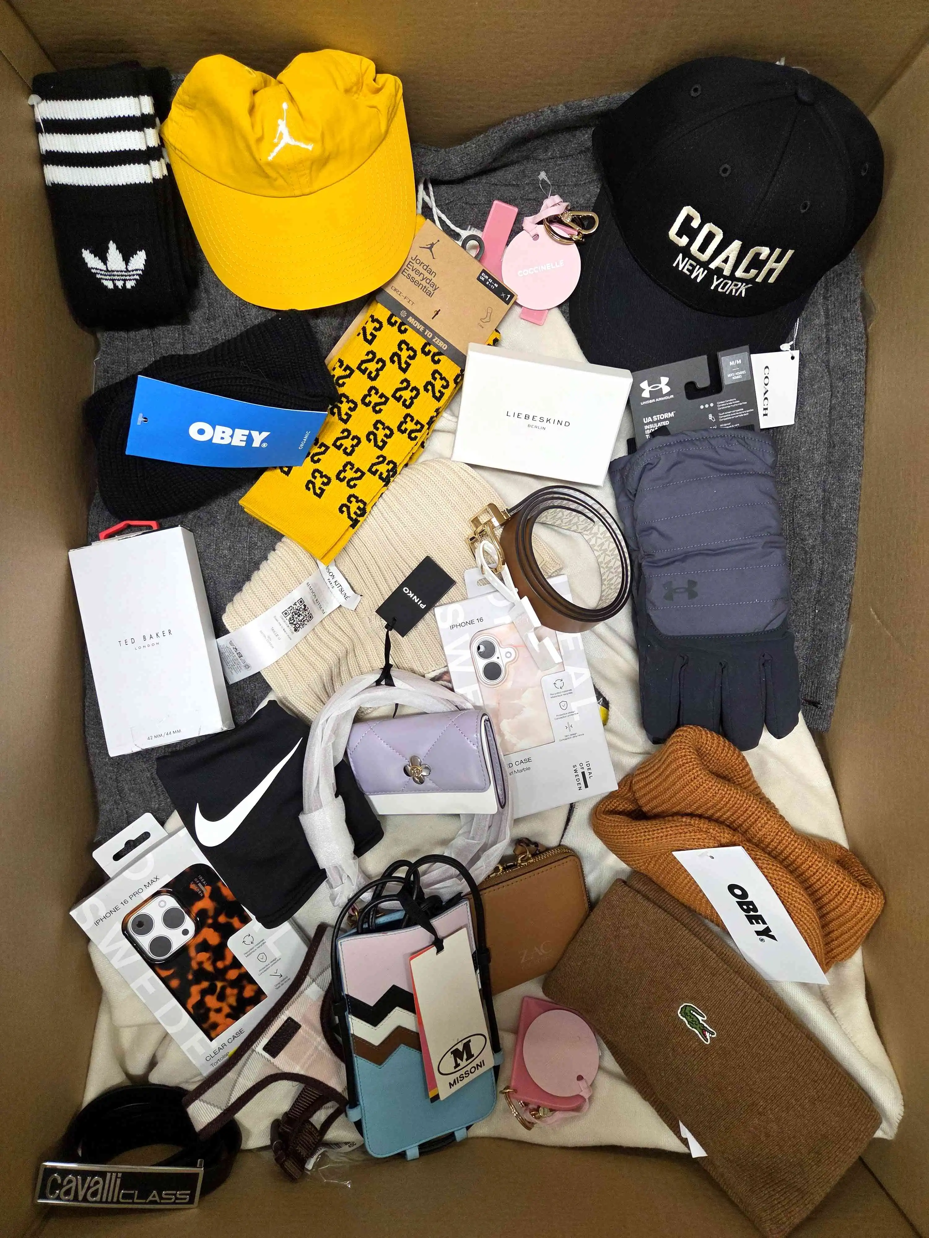 Premium accessories in category B. Inside you will find wallets, belts, scarves, tights, socks, glasses, baseball caps,. Prevalence of winter hats, scarves, gloves . There are 70 pieces in the package.