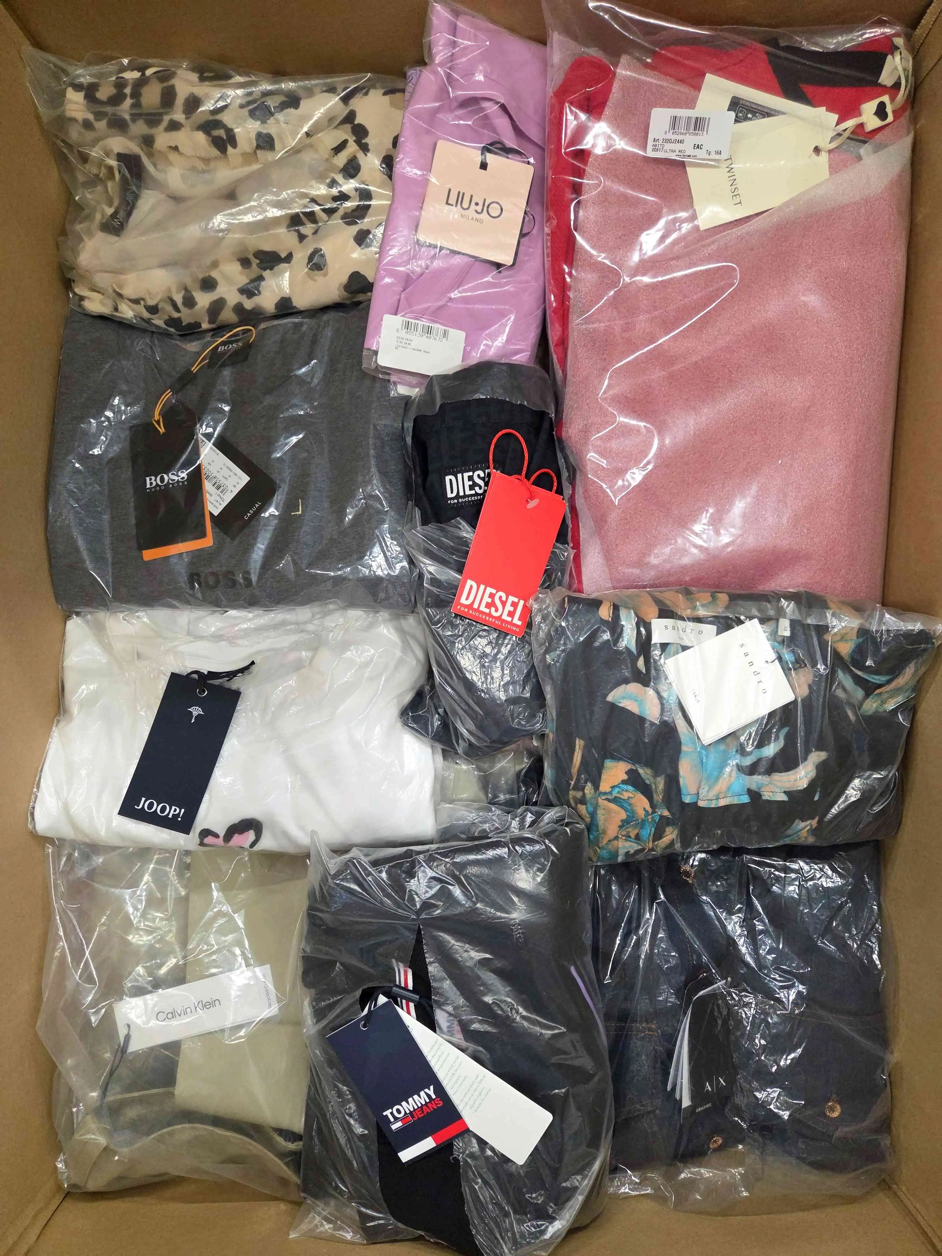 Package contents include: sweatpants/elegant pants, jeans, sweatshirts, sweaters, dresses, t-shirts, shirts, etc. Approximately 99% of garments with original paper tag.