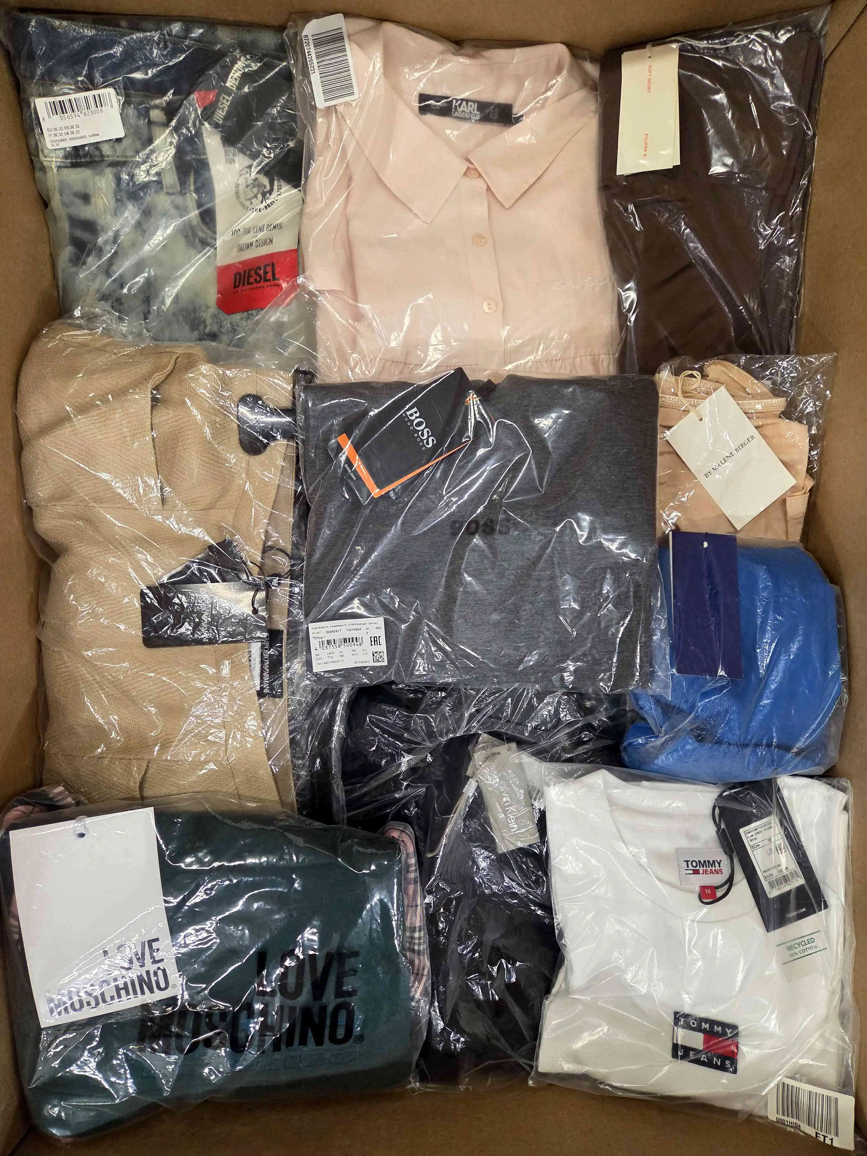 Package contents include: sweatpants/elegant pants, jeans, sweatshirts, sweaters, dresses, t-shirts, shirts, etc. Approximately 99% of garments with original paper tag.