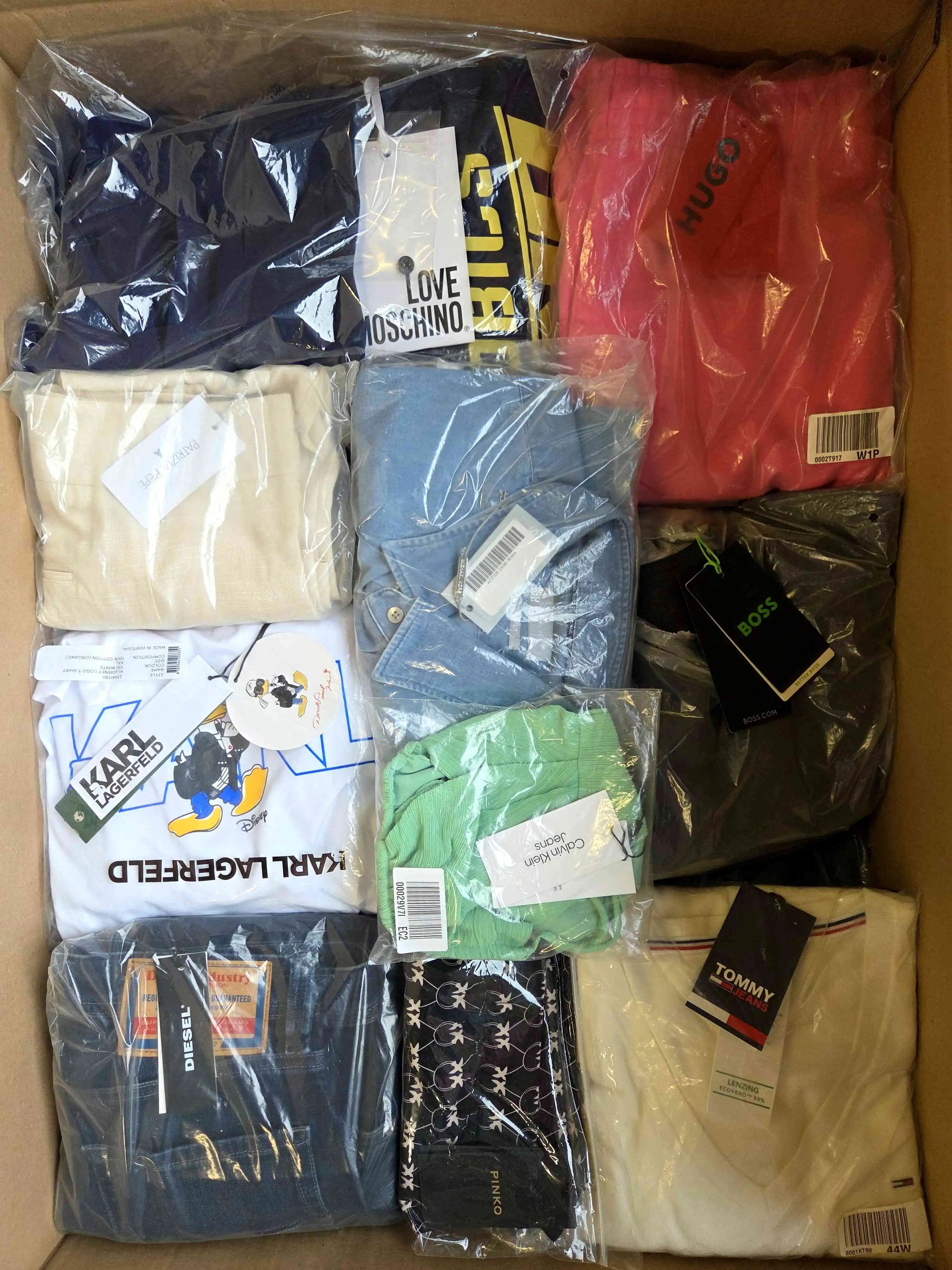 Package contents include: sweatpants/elegant pants, jeans, sweatshirts, sweaters, dresses, t-shirts, shirts, etc. Approximately 99% of garments with original paper tag.