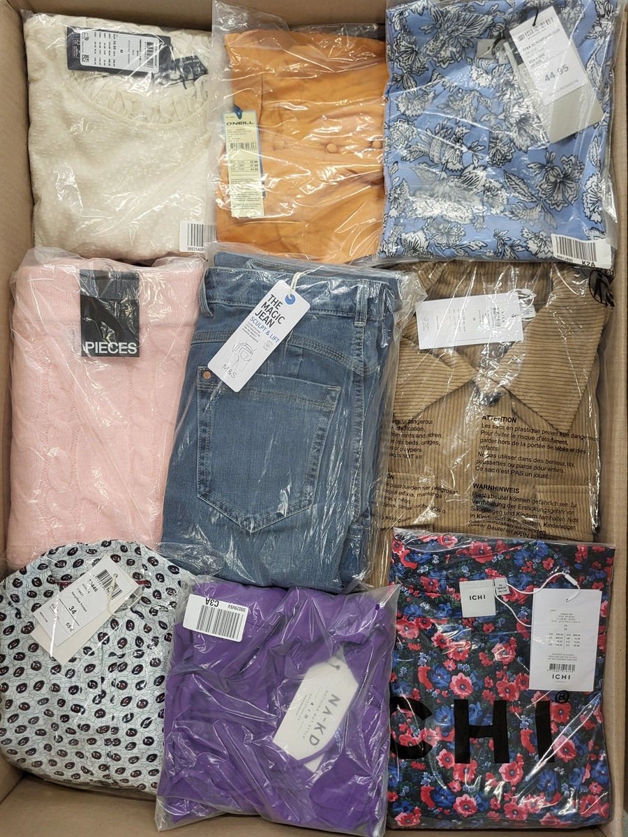 Approximately 100% package with paper tag. The package includes about 90 pcs. The packages include: pants, dresses, blouses (including tops), blouses/shirts, t-shirts. The package contains about 90% women’s clothing and single pieces of men’s and childre