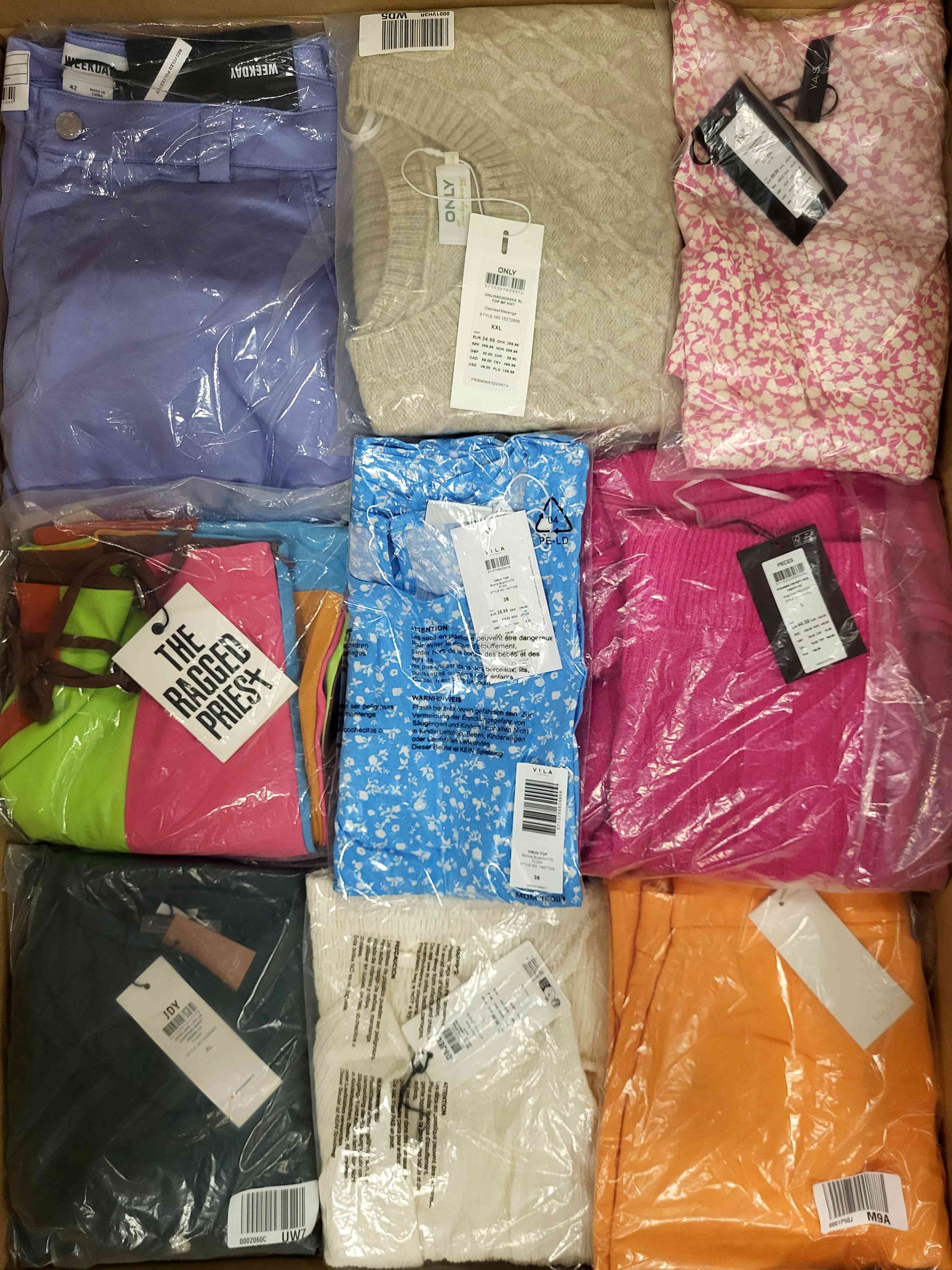 Approximately 100% package with paper tag. The package includes about 90 pcs. The packages include: pants, dresses, blouses (including tops), blouses/shirts, t-shirts. The package contains about 90% women’s clothing and single pieces of men’s and childre
