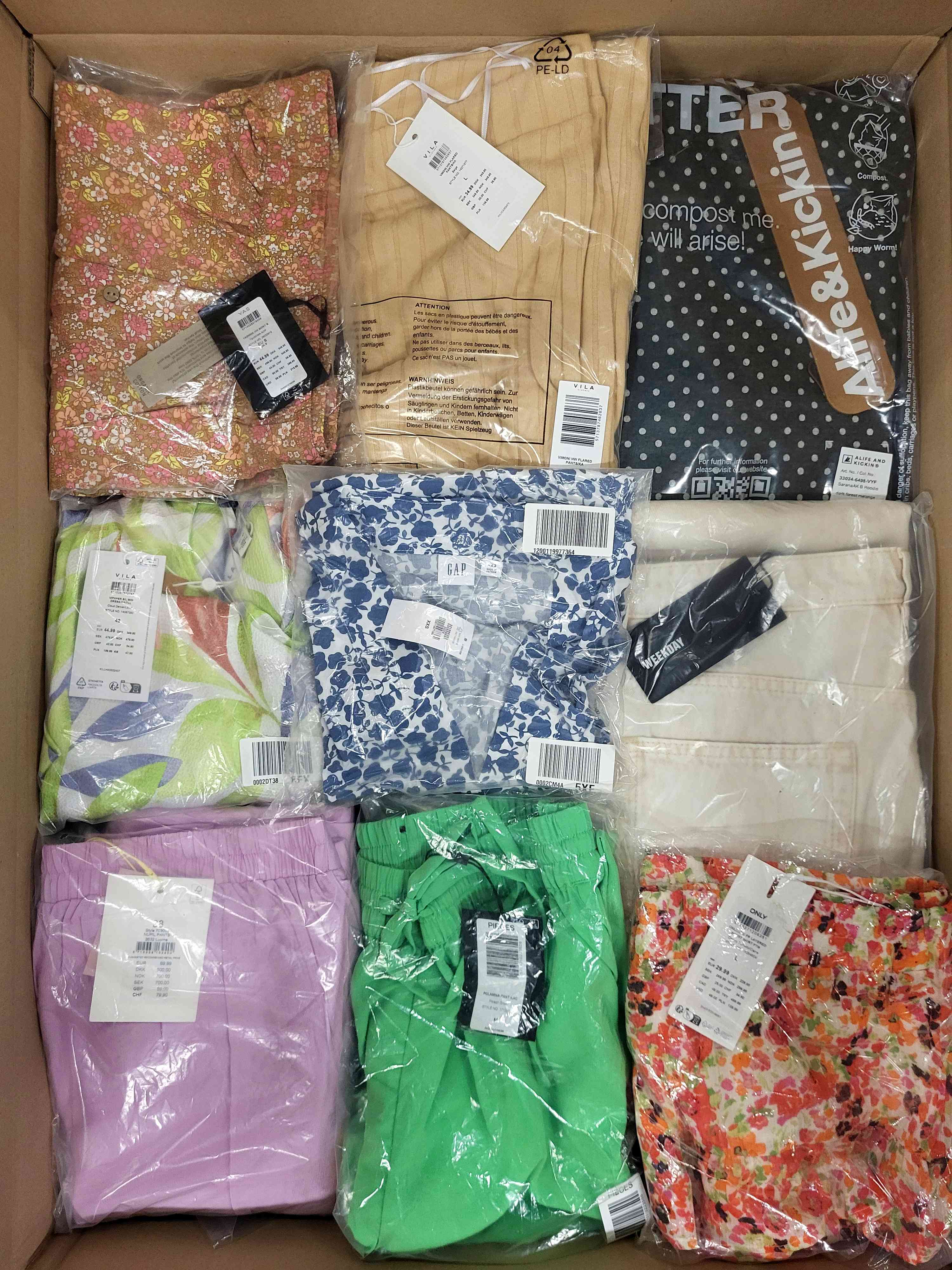 Approximately 100% package with paper tag. The package includes about 90 pcs. The packages include: pants, dresses, blouses (including tops), blouses/shirts, t-shirts. The package contains about 90% women’s clothing and single pieces of men’s and childre