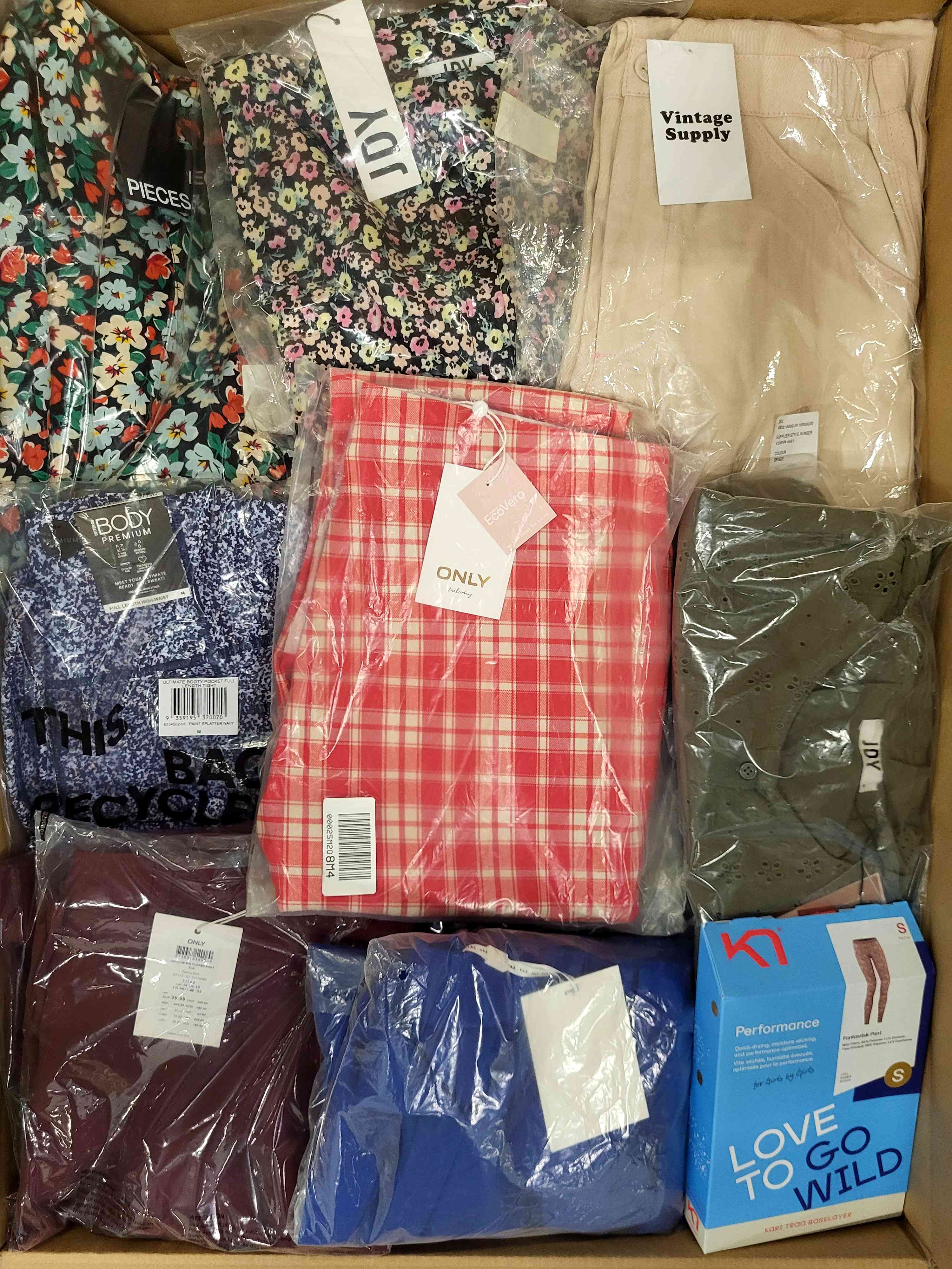 Approximately 100% package with paper tag. The package includes about 90 pcs. The packages include: pants, dresses, blouses (including tops), blouses/shirts, t-shirts. The package contains about 90% women’s clothing and single pieces of men’s and childre