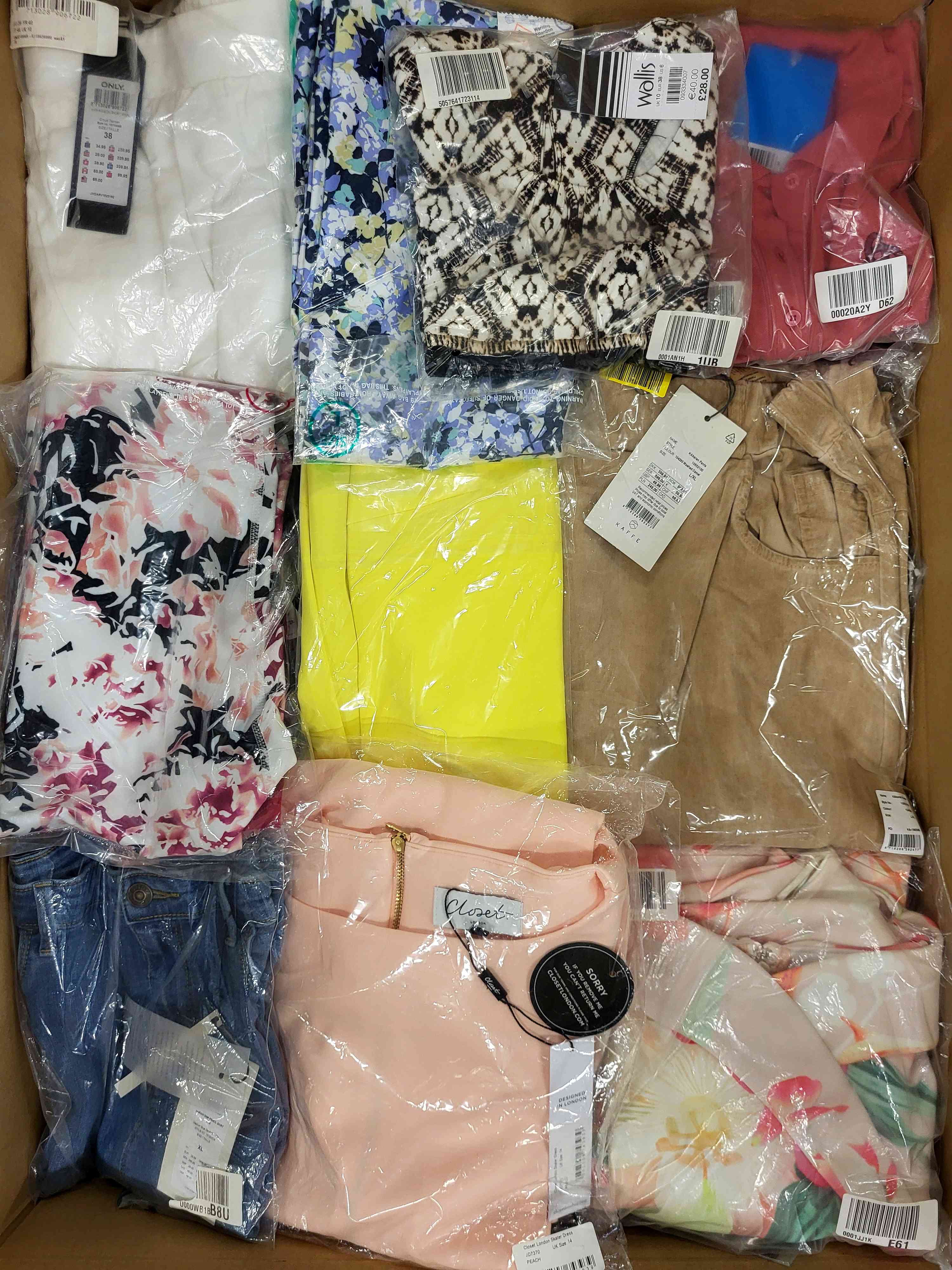 Approximately 100% package with paper tag. The package includes about 90 pcs. The packages include: pants, dresses, blouses (including tops), blouses/shirts, t-shirts. The package contains about 90% women’s clothing and single pieces of men’s and childre