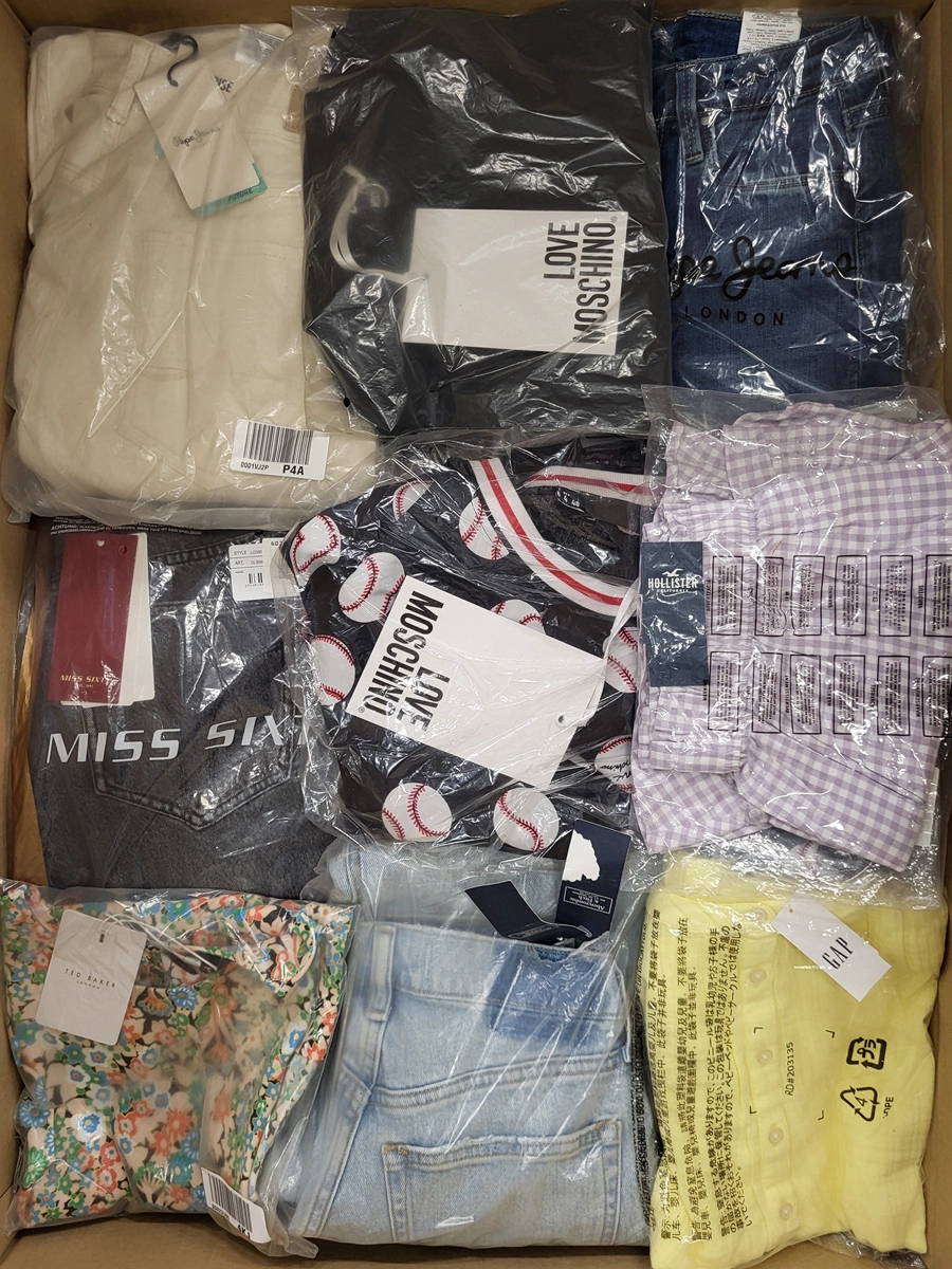 Women’s clothing package containing a mix of brands in quality category A. Approx. 100% of the package with a paper label, and 15-20% are the most recognizable brands. The top layer shown is the contents of this package and shows the best brands.
