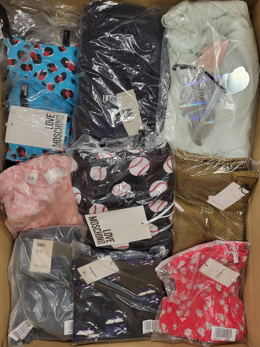Women’s clothing package containing a mix of brands in quality category A. Approx. 100% of the package with a paper label, and 15-20% are the most recognizable brands. The top layer shown is the contents of this package and shows the best brands.