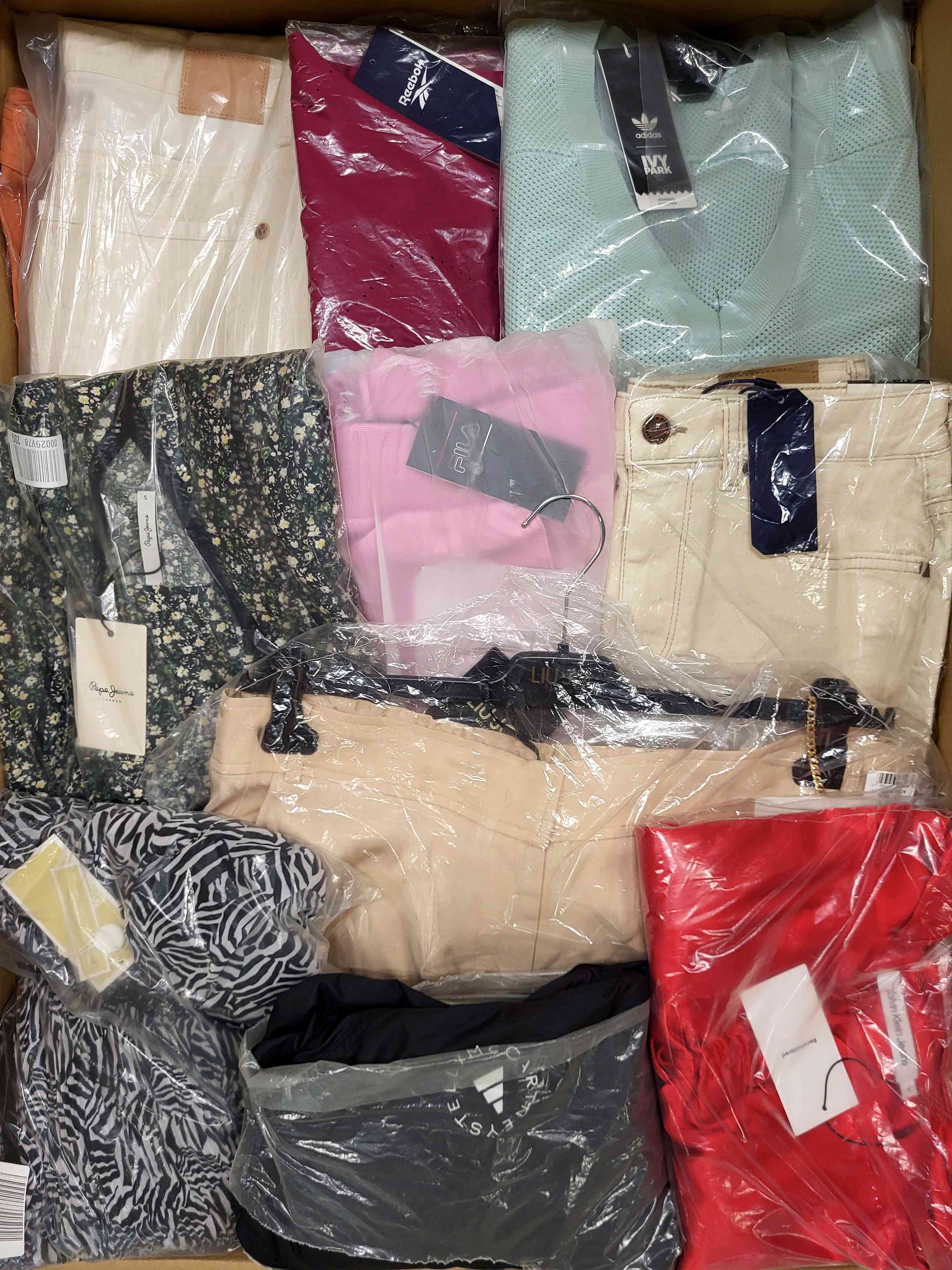 Women’s clothing package containing a mix of brands in quality category A. Approx. 100% of the package with a paper label, and 25% are the most recognizable brands. The top layer shown is the contents of this package and shows the best brands.