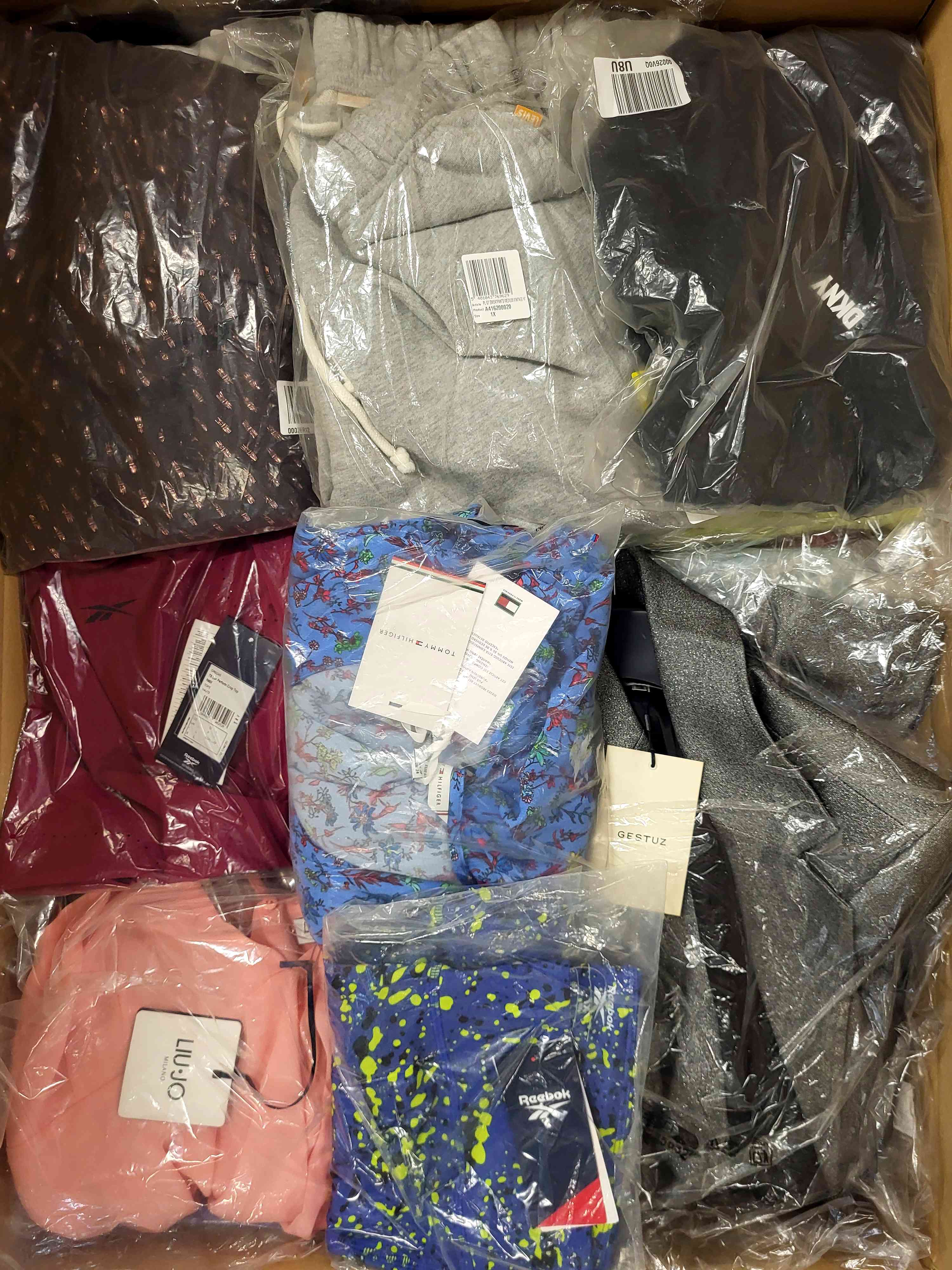 Women’s clothing package containing a mix of brands in quality category A. Approx. 100% of the package with a paper label, and 25% are the most recognizable brands. The top layer shown is the contents of this package and shows the best brands.