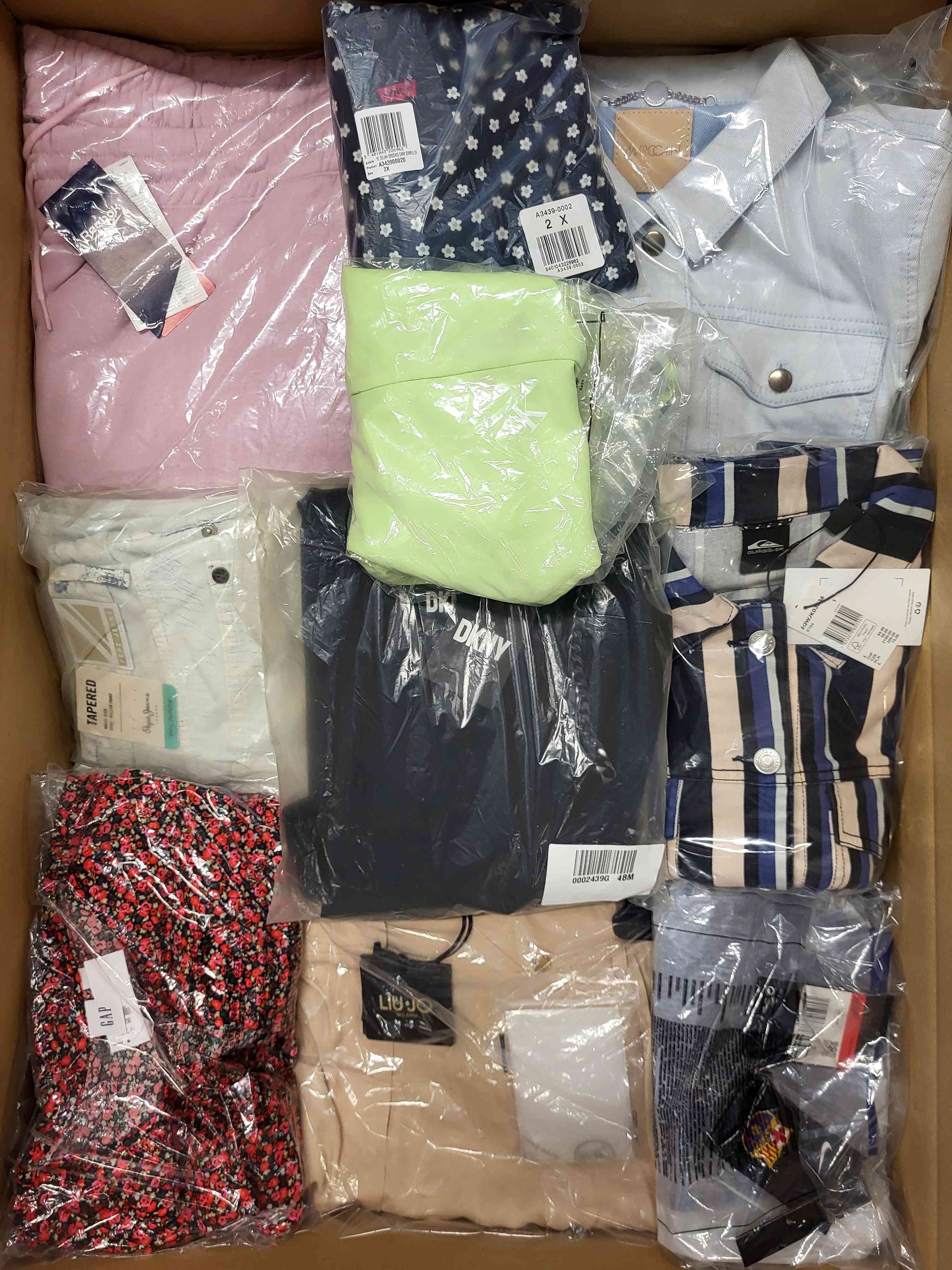 Women’s clothing package containing a mix of brands in quality category A. Approx. 100% of the package with a paper label, and 25% are the most recognizable brands. The top layer shown is the contents of this package and shows the best brands.