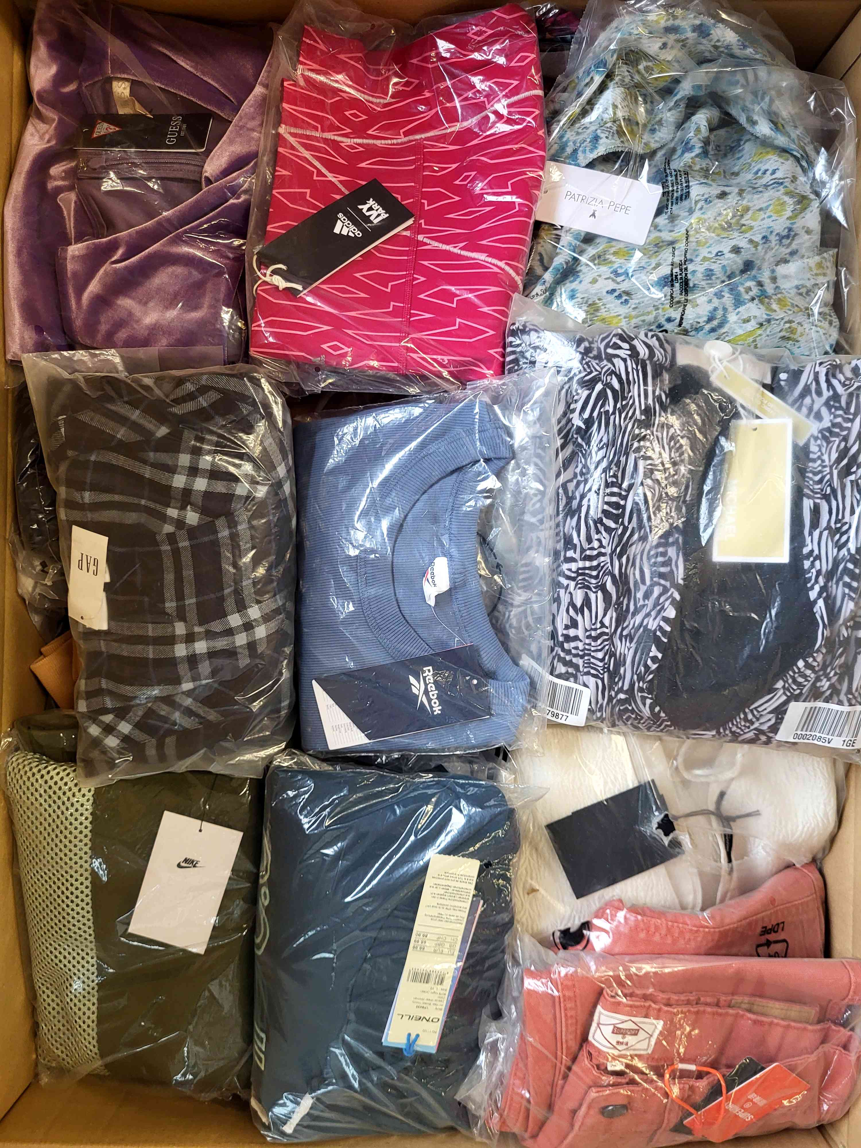 Women’s clothing package containing a mix of brands in quality category A. Approx. 100% of the package with a paper label, and 25% are the most recognizable brands. The top layer shown is the contents of this package and shows the best brands.
