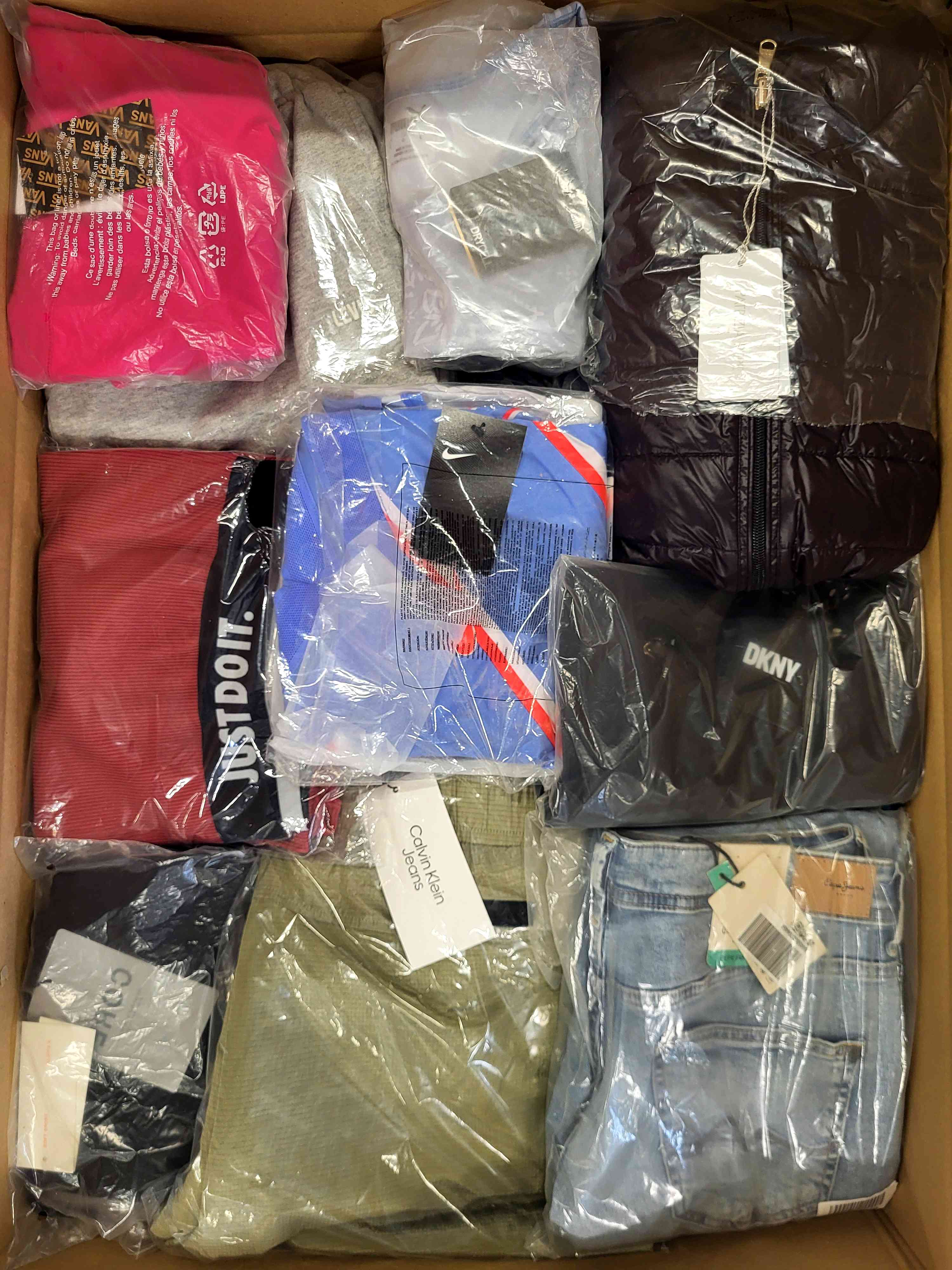 Women’s clothing package containing a mix of brands in quality category A. Approx. 100% of the package with a paper label, and 25% are the most recognizable brands. The top layer shown is the contents of this package and shows the best brands.