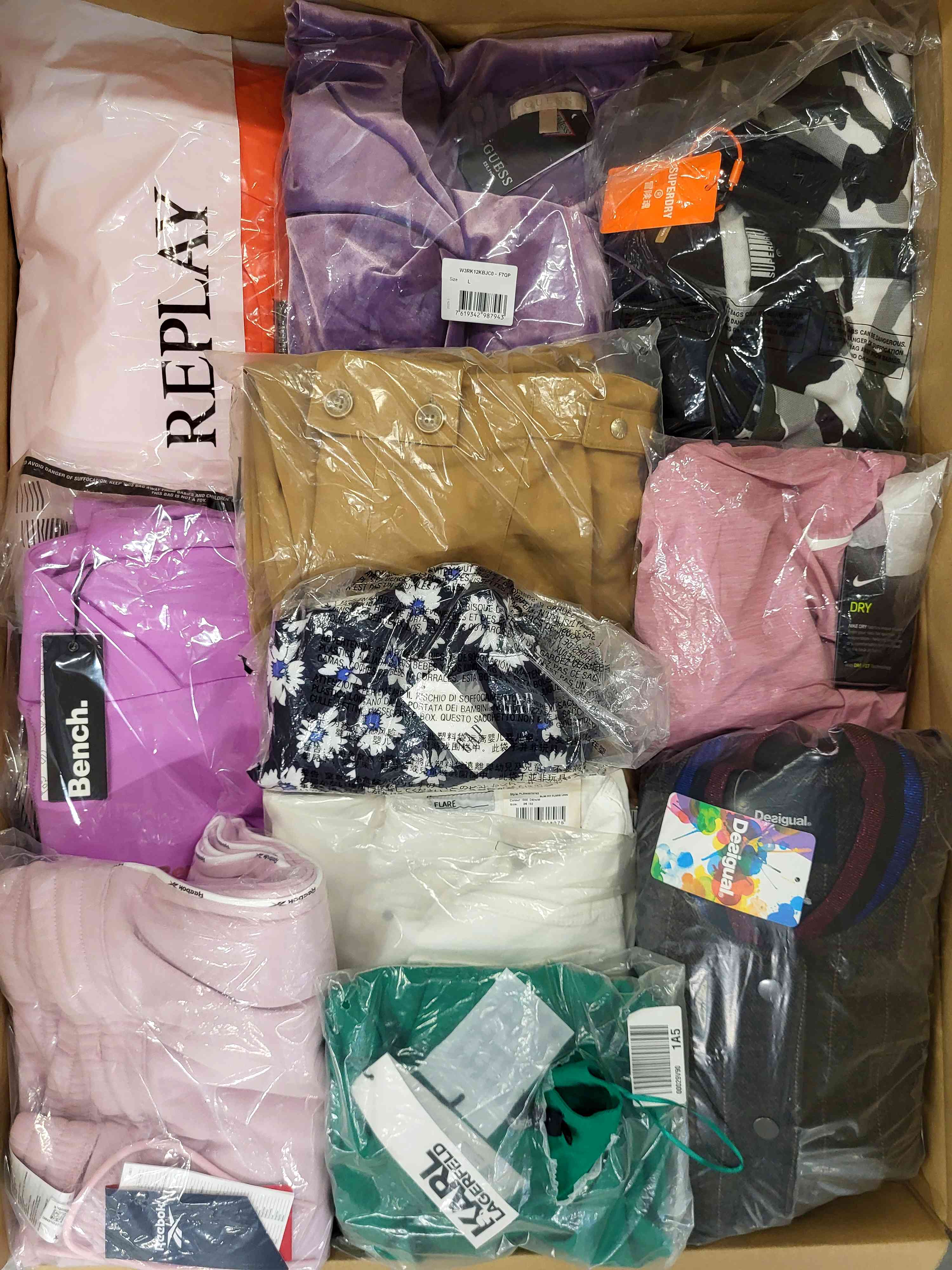 Women’s clothing package containing a mix of brands in quality category A. Approx. 100% of the package with a paper label, and 25% are the most recognizable brands. The top layer shown is the contents of this package and shows the best brands.
