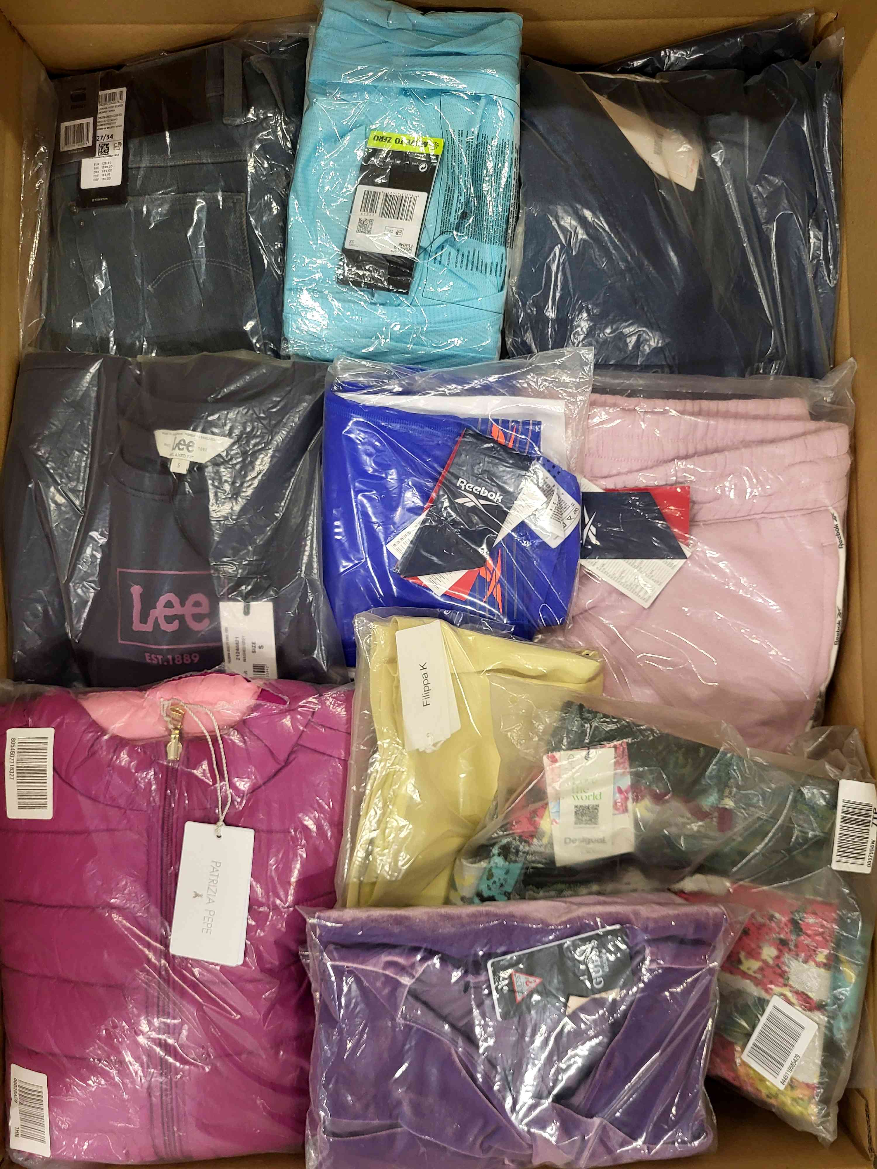 Women’s clothing package containing a mix of brands in quality category A. Approx. 100% of the package with a paper label, and 25% are the most recognizable brands. The top layer shown is the contents of this package and shows the best brands.