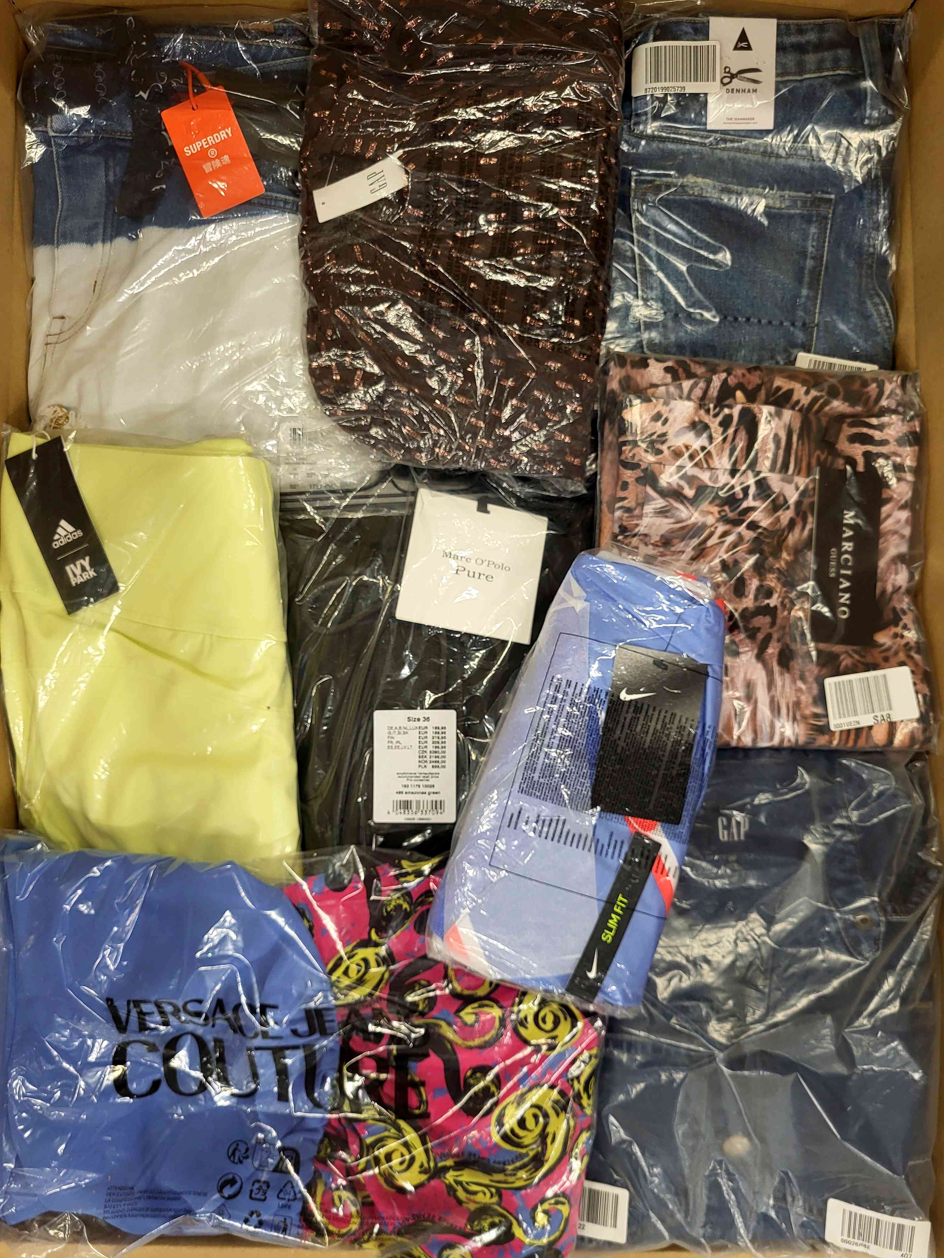 Women’s clothing package containing a mix of brands in quality category A. Approx. 100% of the package with a paper label, and 25% are the most recognizable brands. The top layer shown is the contents of this package and shows the best brands.