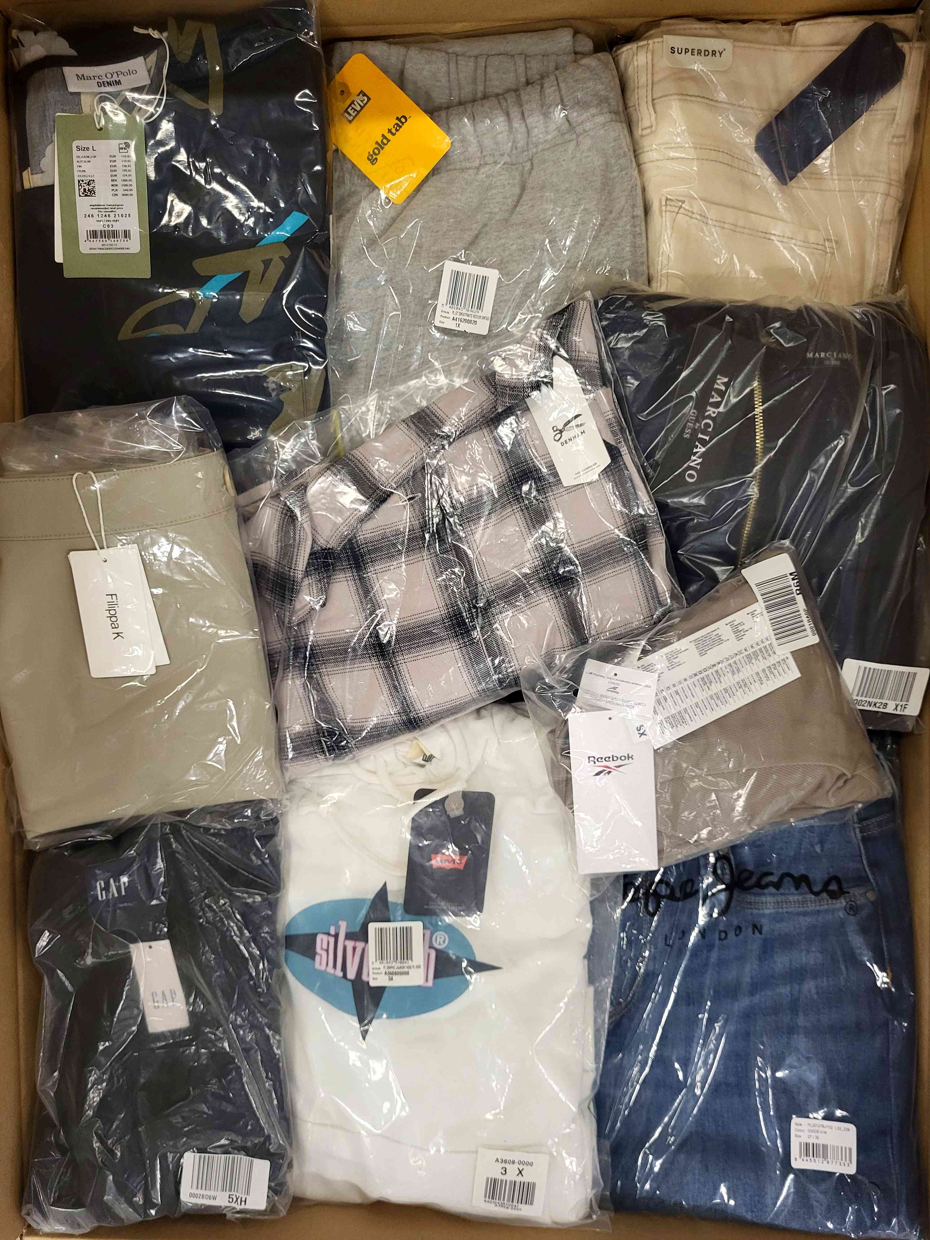 Women’s clothing package containing a mix of brands in quality category A. Approx. 100% of the package with a paper label, and 25% are the most recognizable brands. The top layer shown is the contents of this package and shows the best brands.