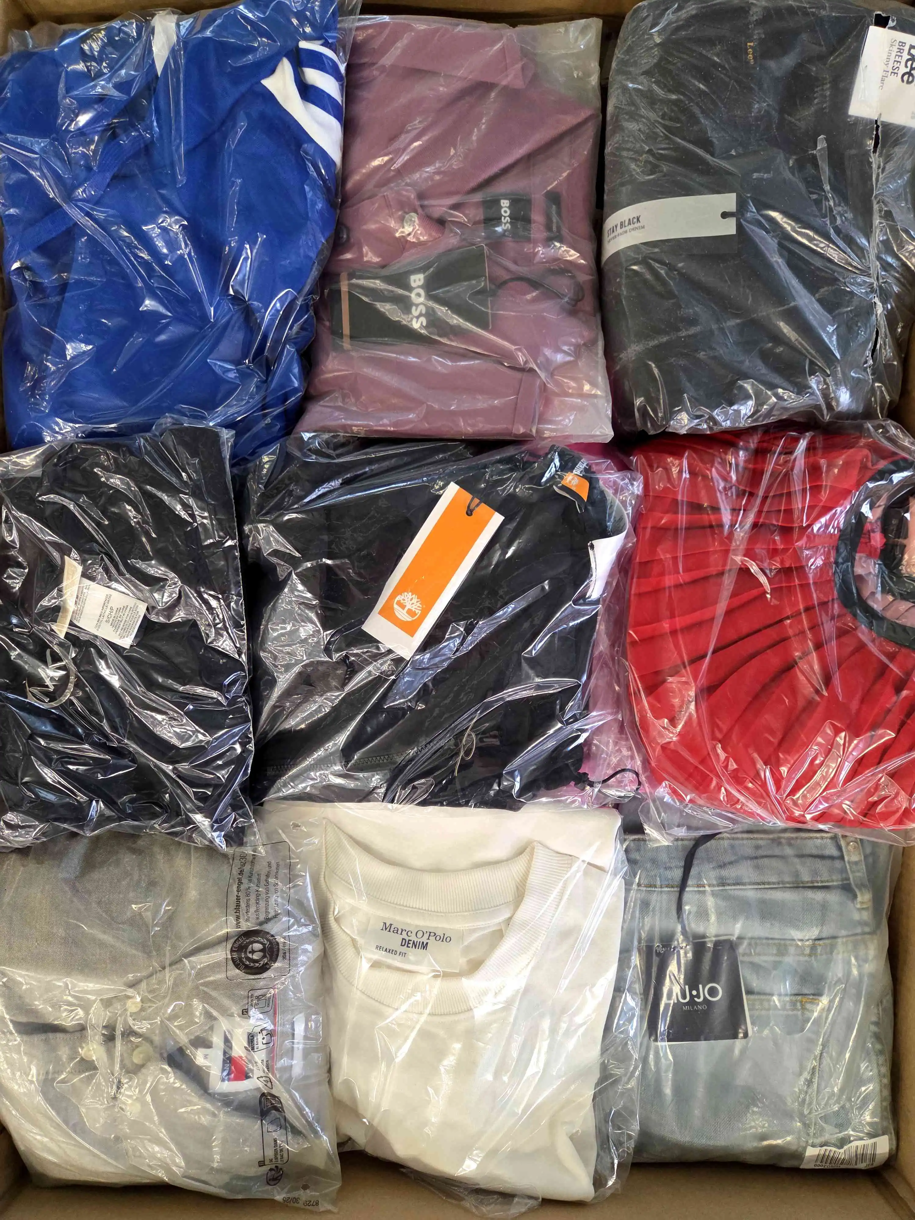Clothing package containing a mix of brands in category B. The garments in this category may have minimal, mostly reversible defects, e.g., in the form of a soiling, a small hole or a pulled thread, etc.
