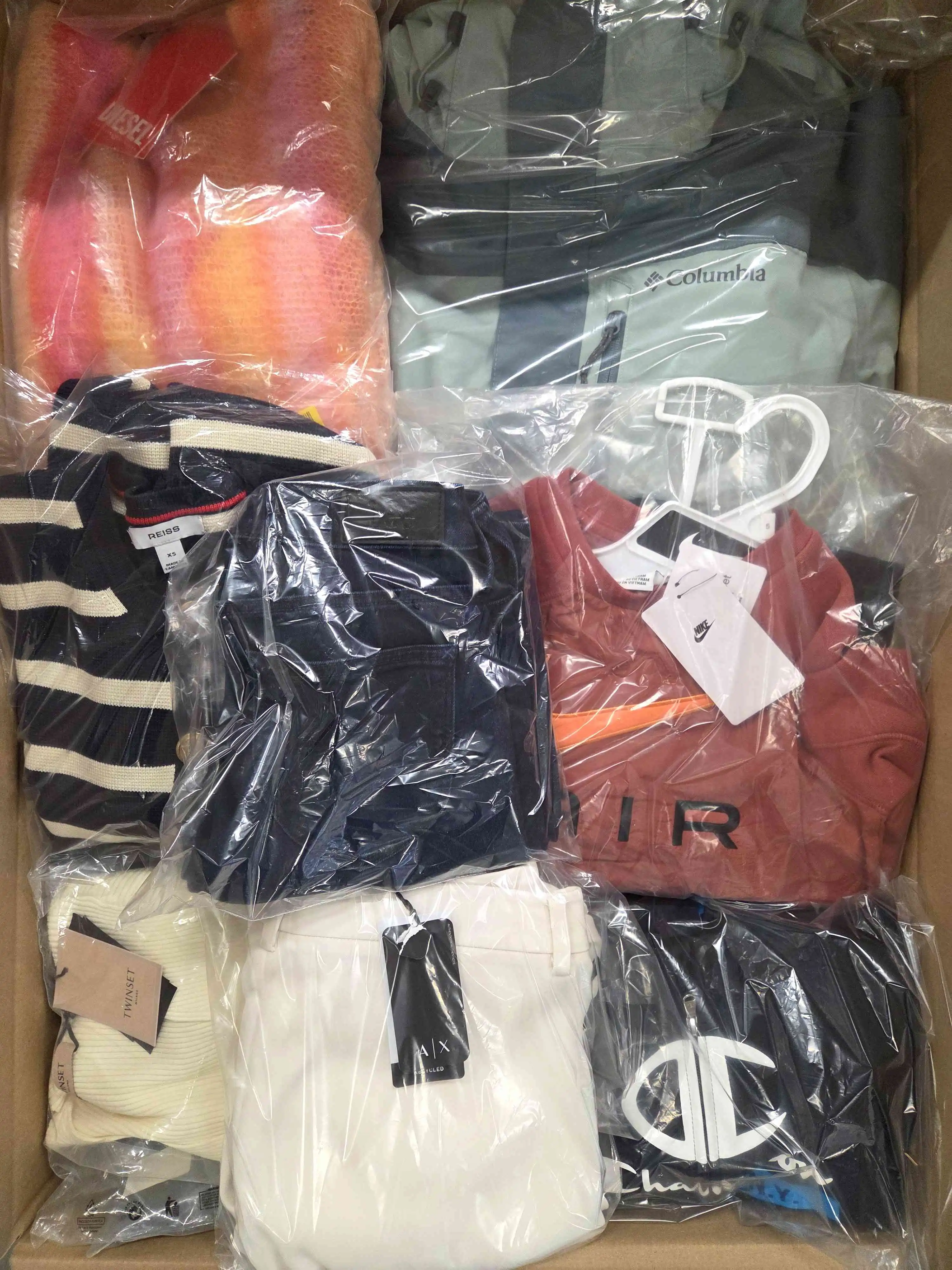 Clothing package containing a mix of brands in category B. The garments in this category may have minimal, mostly reversible defects, e.g., in the form of a soiling, a small hole or a pulled thread, etc.