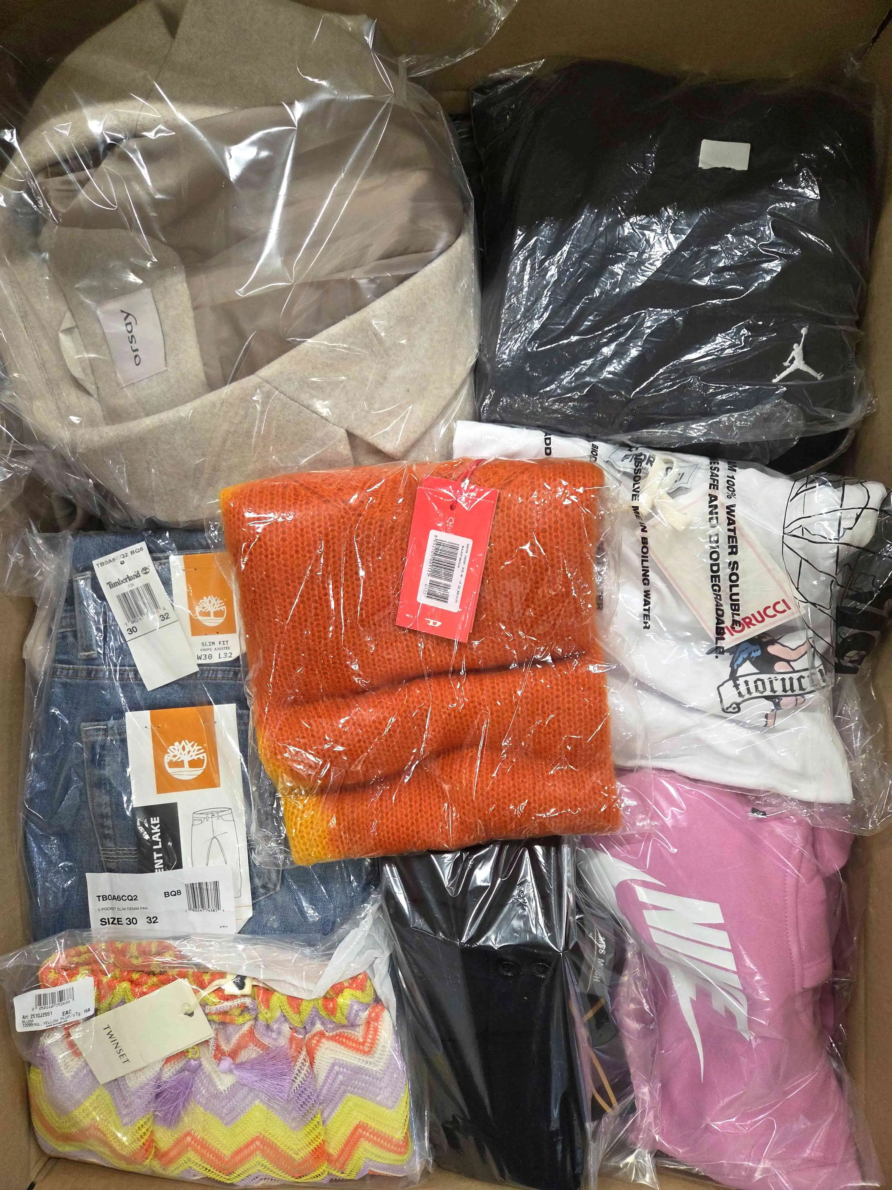 Clothing package containing a mix of brands in category B. The garments in this category may have minimal, mostly reversible defects, e.g., in the form of a soiling, a small hole or a pulled thread, etc.