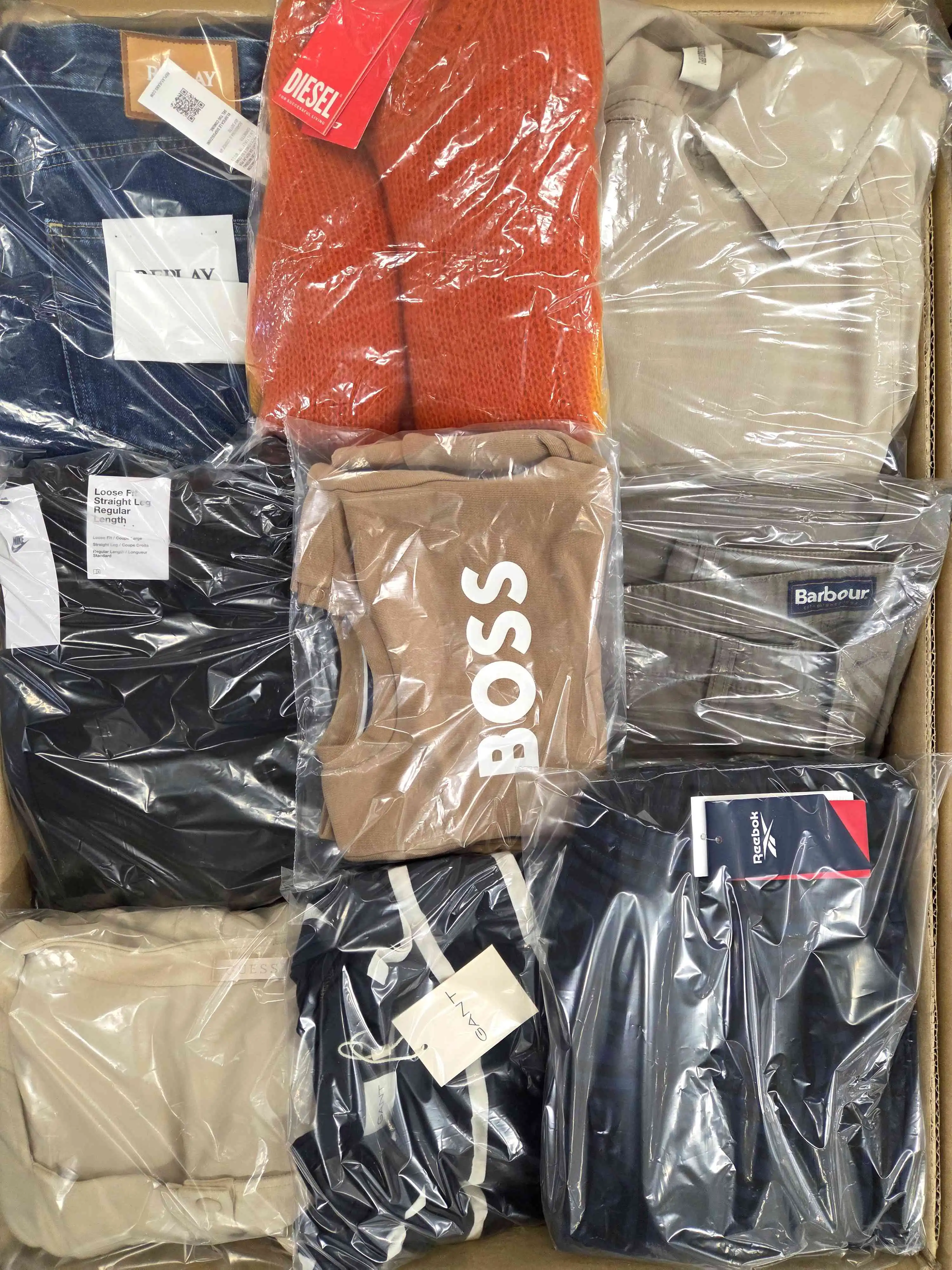 Clothing package containing a mix of brands in category B. The garments in this category may have minimal, mostly reversible defects, e.g., in the form of a soiling, a small hole or a pulled thread, etc.