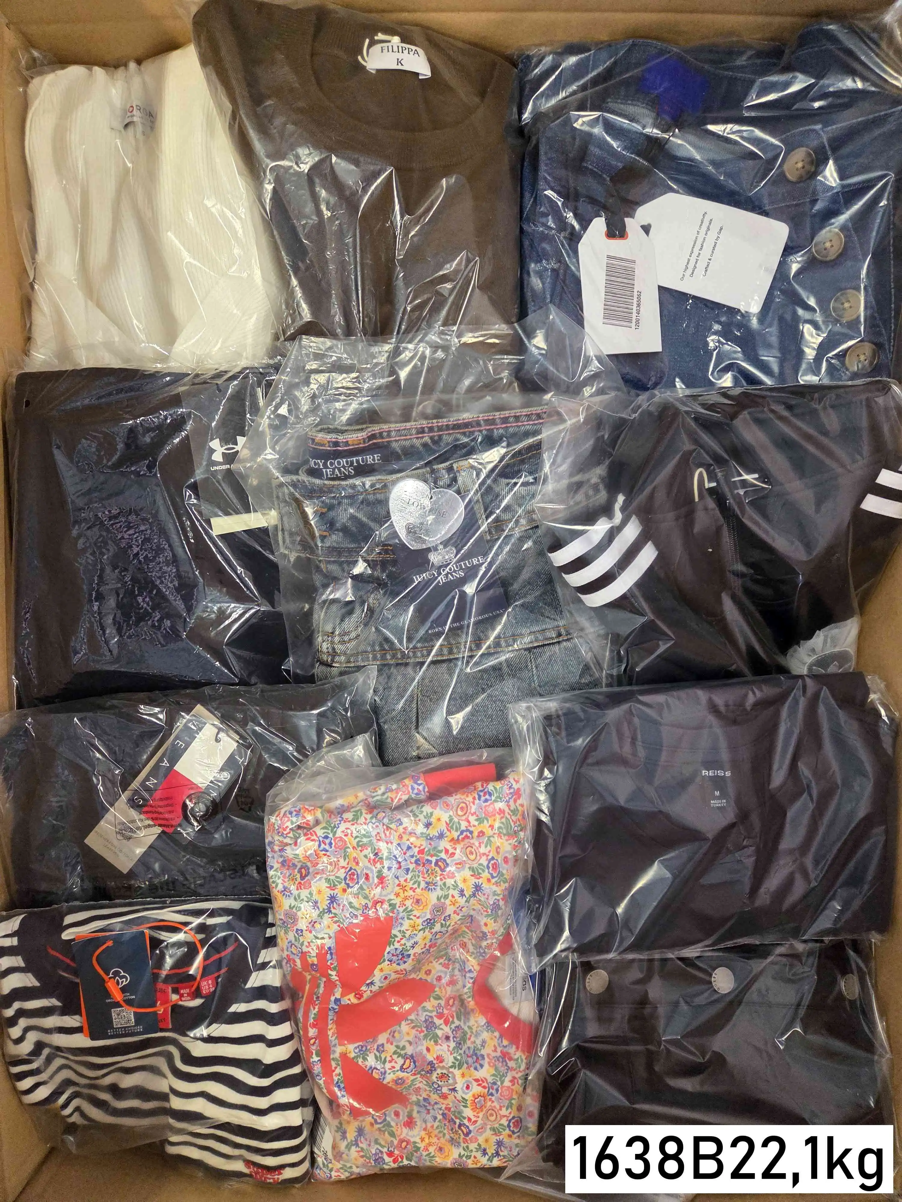 Clothing package containing a mix of brands in category B. The garments in this category may have minimal, mostly reversible defects, e.g., in the form of a soiling, a small hole or a pulled thread, etc.