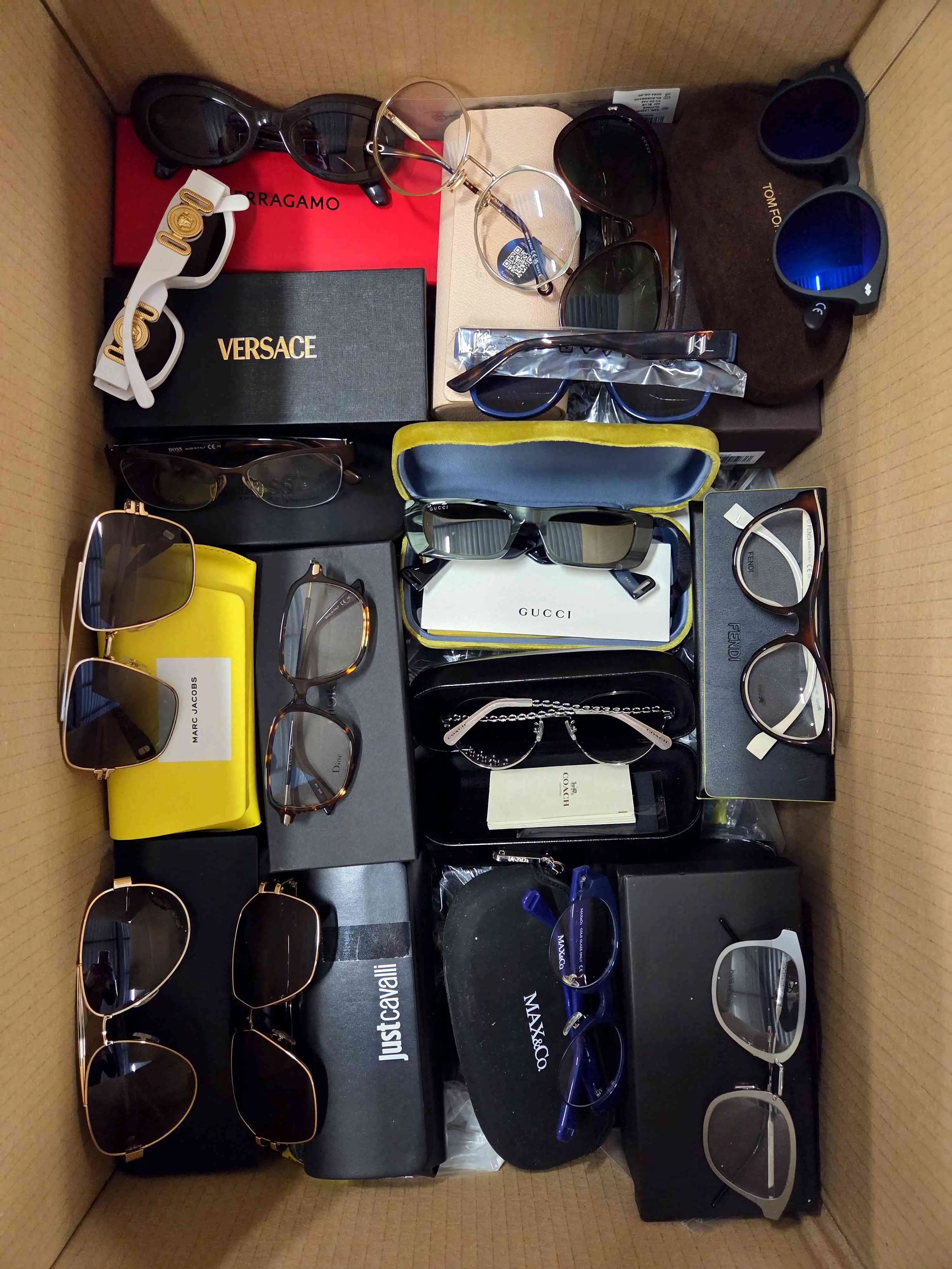 The package contains 50 pairs of glasses, including 28 branded and 22 non-branded models. The mix includes both sunglasses and prescription frames, sourced from major e-commerce platforms.