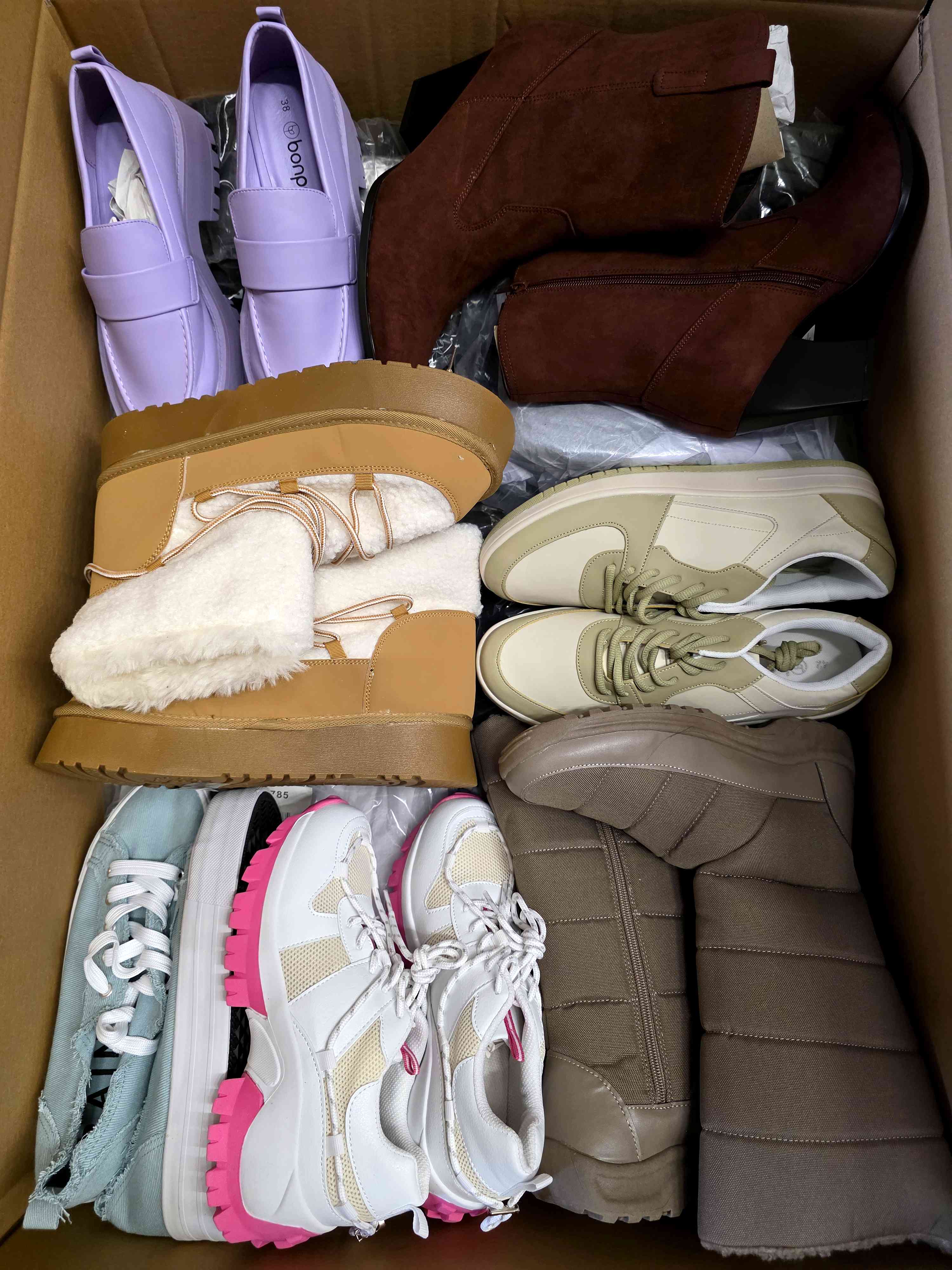 It’s a diverse mix of women’s and men’s shoes, covering various sizes and seasons.