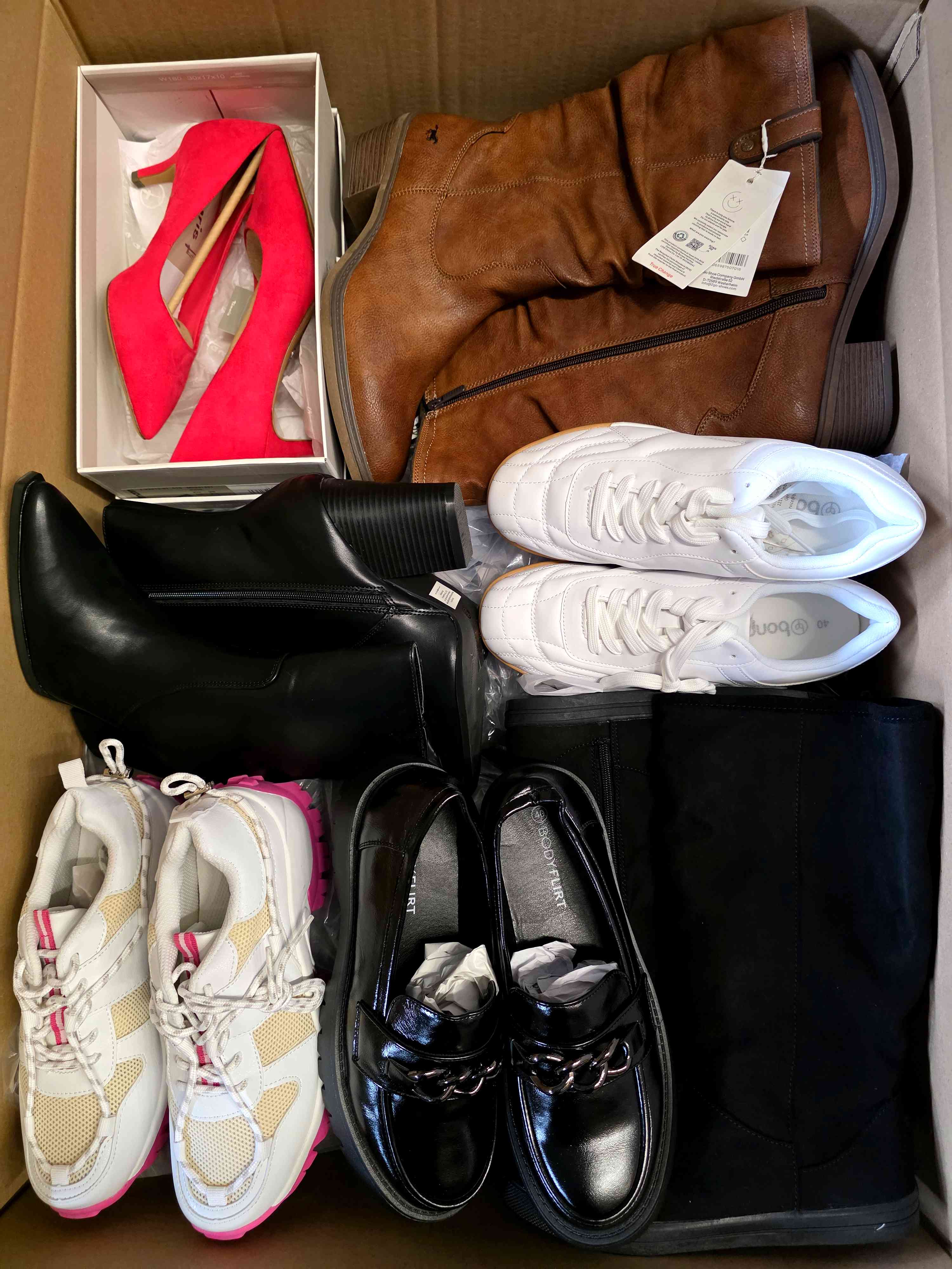 It’s a diverse mix of women’s and men’s shoes, covering various sizes and seasons.