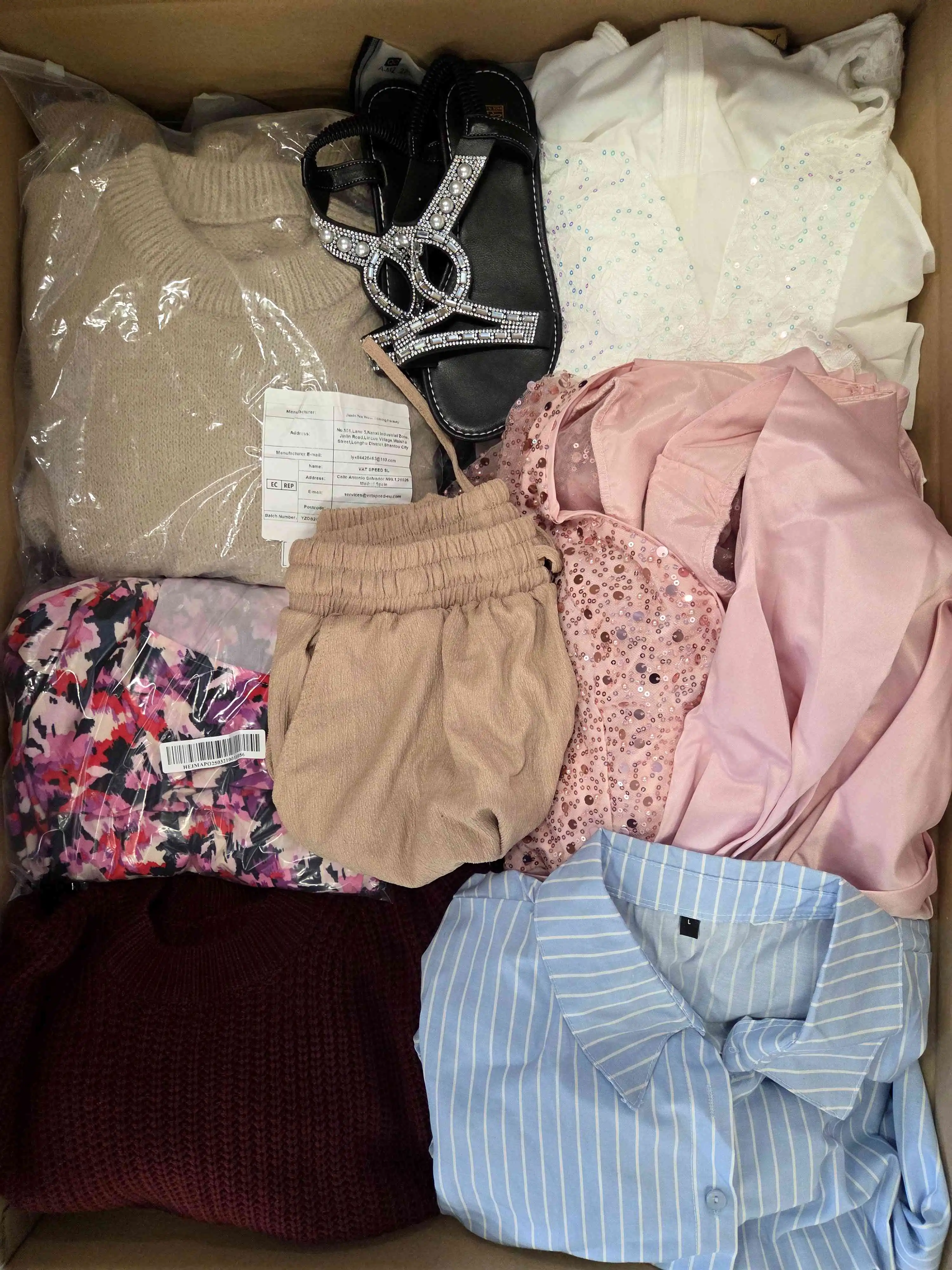 A package of clothing, footwear, and accessories in B/C grade from a well-known Asian brand. The package includes fashionable clothes, comfortable shoes, and stylish accessories in various sizes and styles.