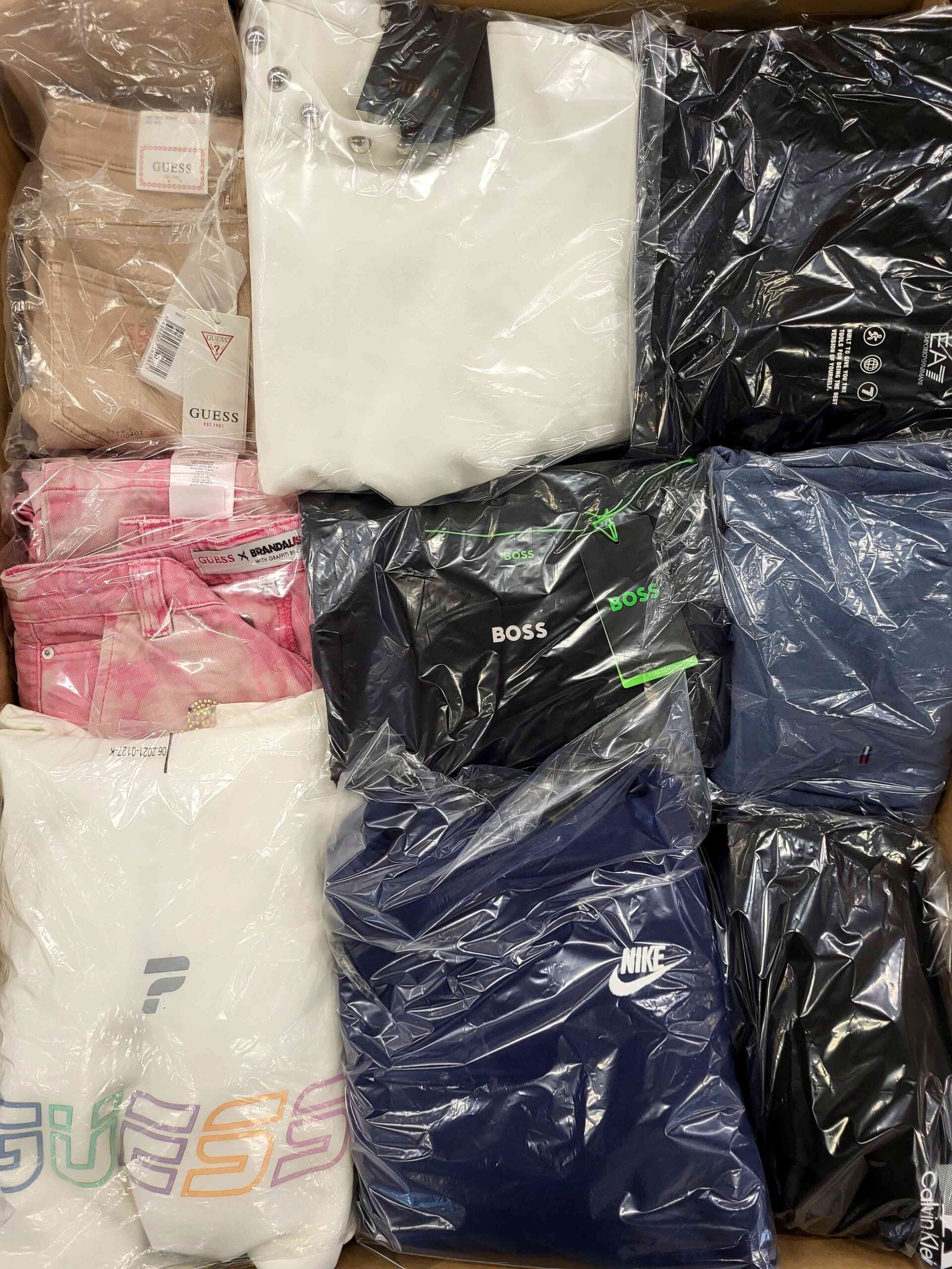 The package includes about 55 garments, and about 35% are the most recognizable brands. The package includes about 65% of women’s clothing, about 35% of men’s clothing and single units of children’s clothing. Directly from one of the largest eCommerce platforms in Europe. The top layer shown is the contents of this package and represents the top brands.