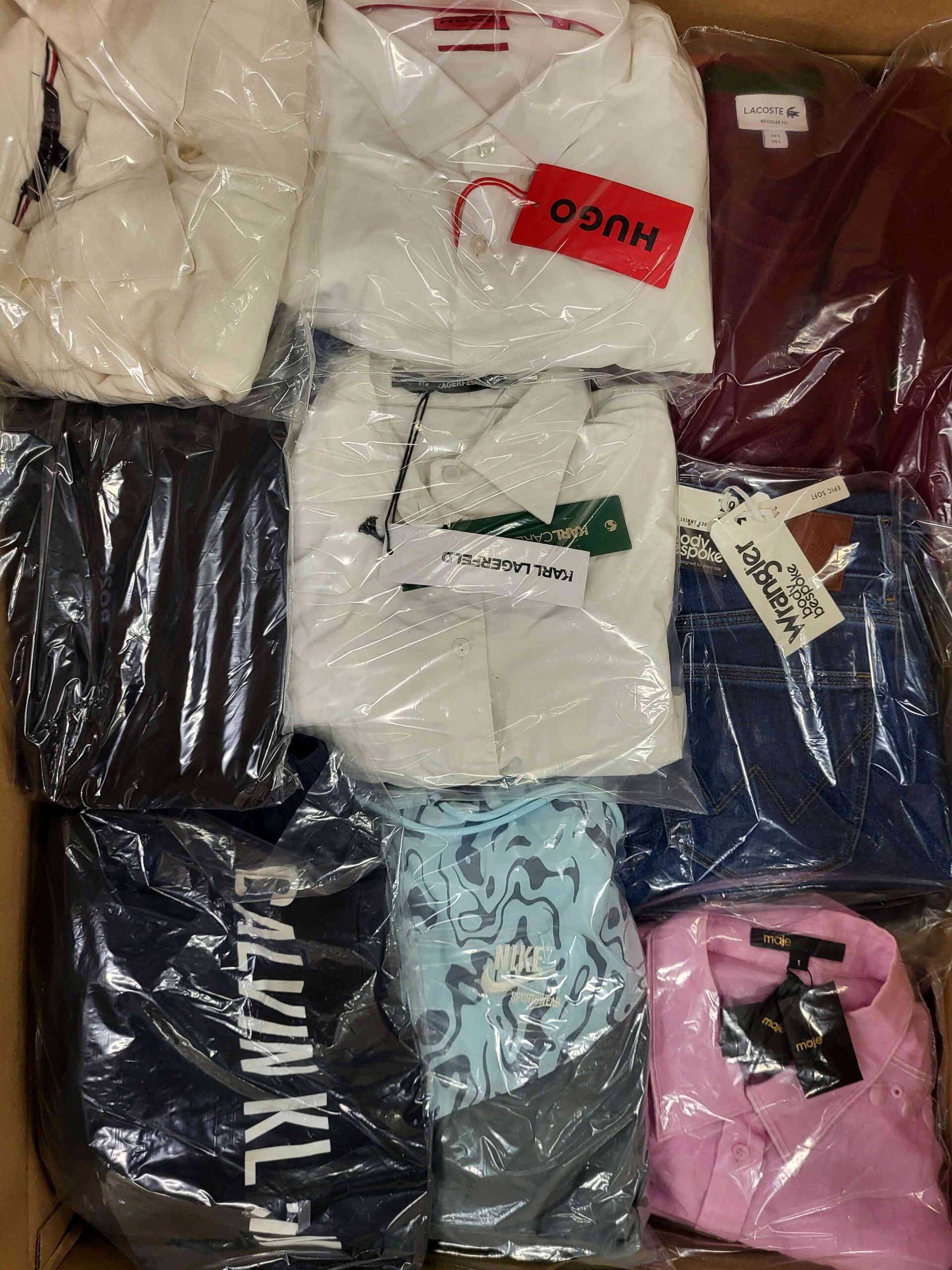 Clothing package containing a mix of brands in category C. Clothing has visible or significant signs of use or defects (discoloration, holes, jams, torn zippers, stains, missing buttons.