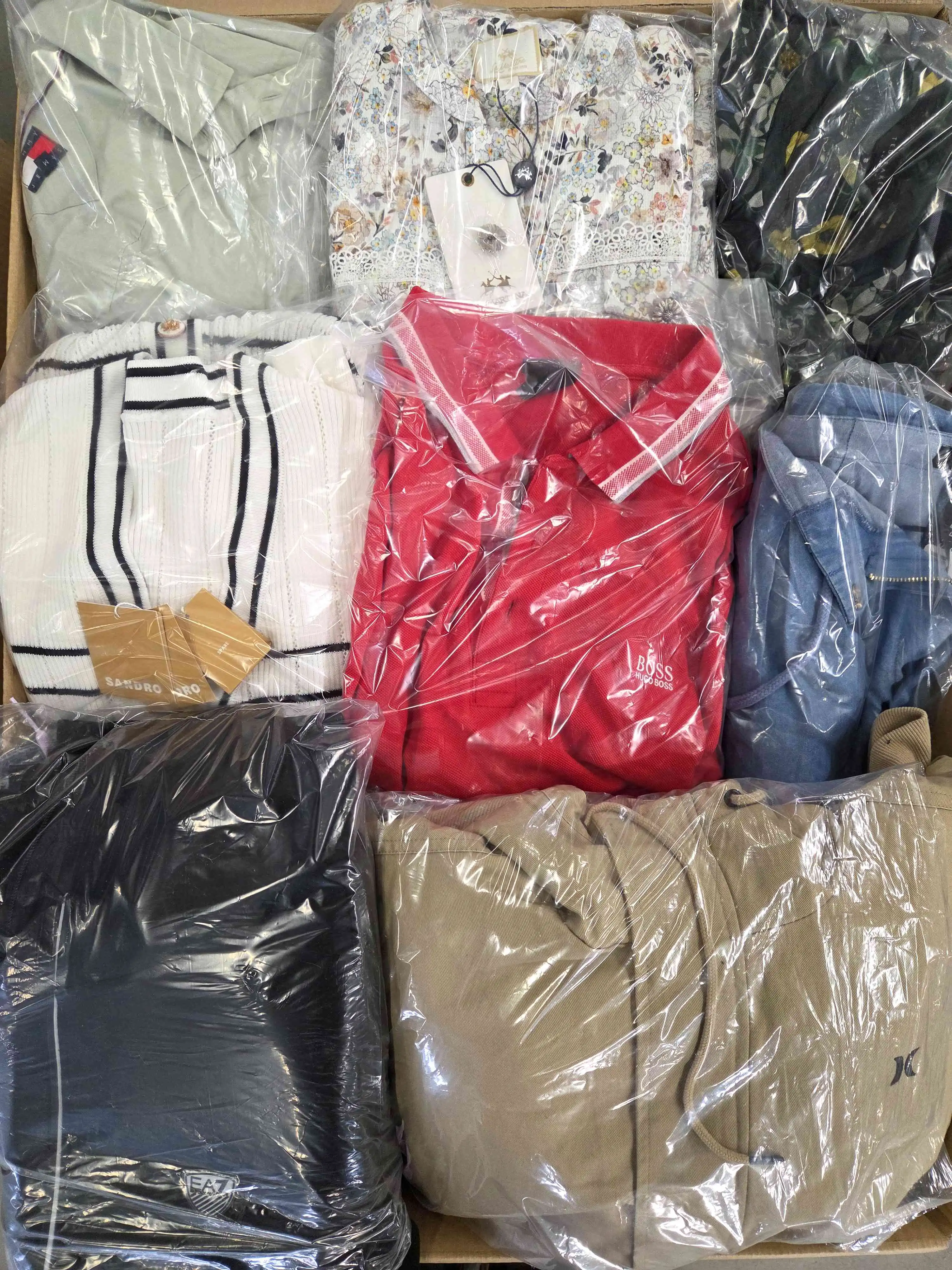 Clothing package containing a mix of brands in category C. Clothing has visible or significant signs of use or defects (discoloration, holes, jams, torn zippers, stains, missing buttons.