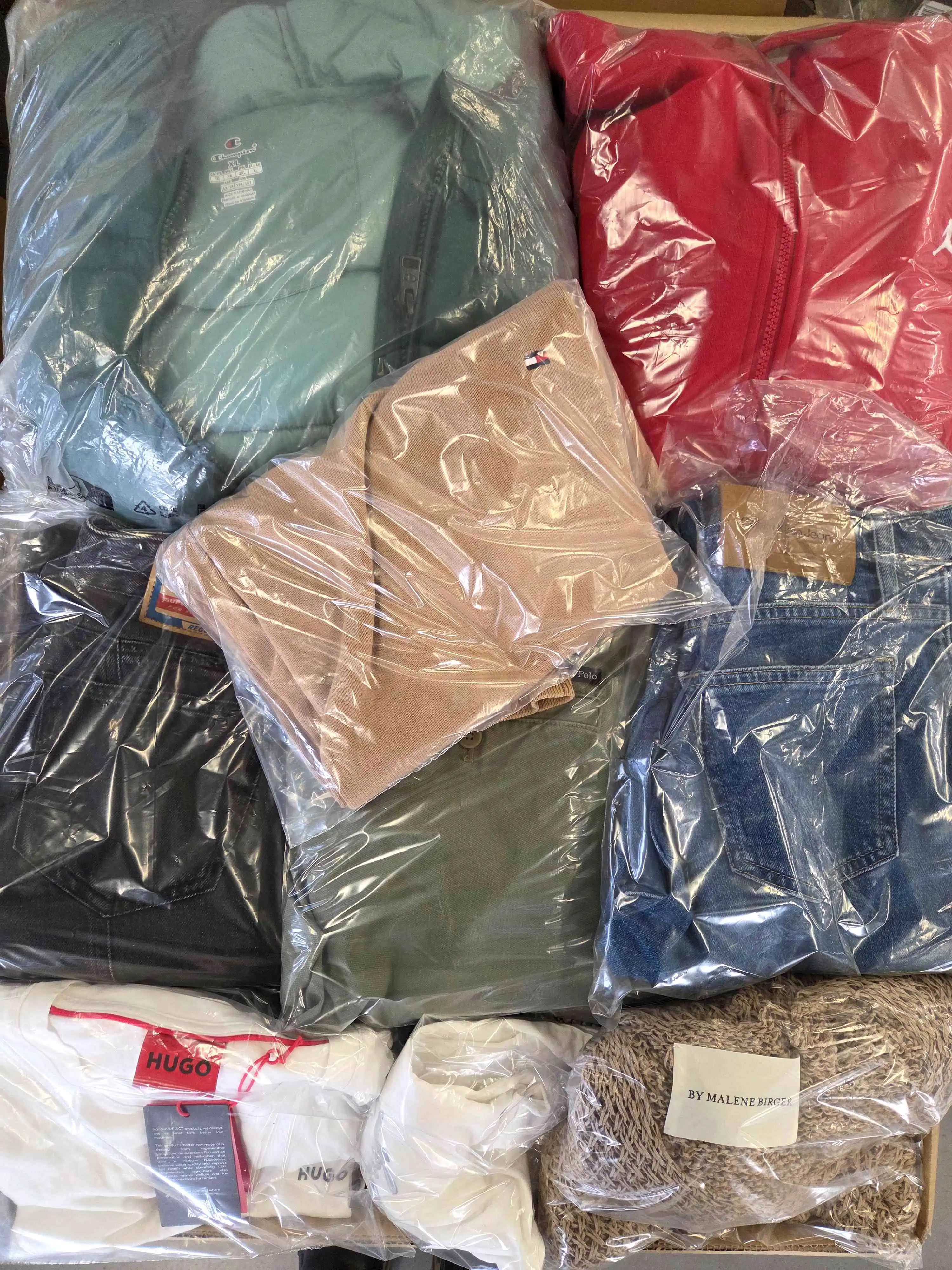 Clothing package containing a mix of brands in category C. Clothing has visible or significant signs of use or defects (discoloration, holes, jams, torn zippers, stains, missing buttons.