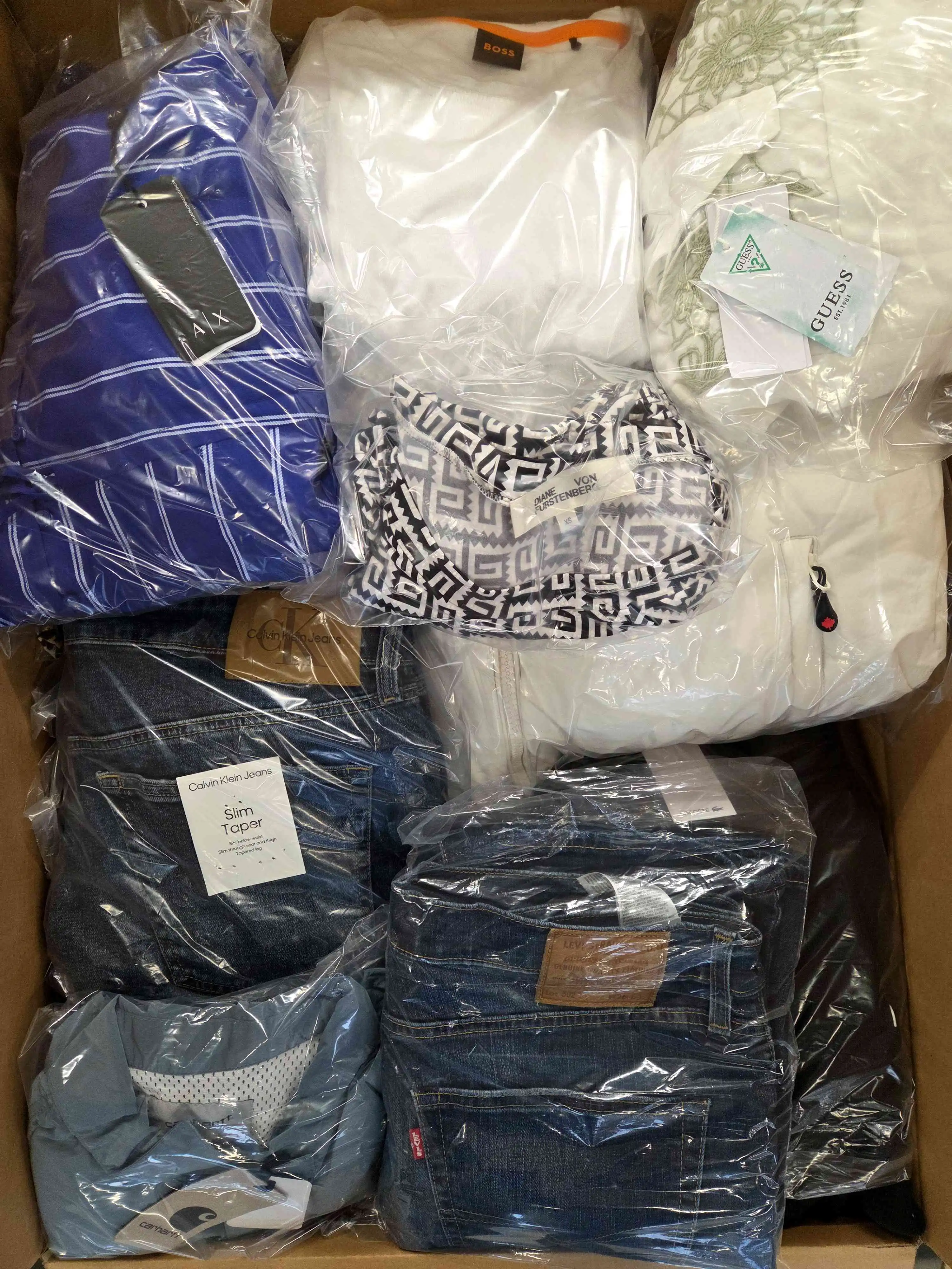The package includes about 55 garments, and about 30% are the most recognizable brands. The package includes about 65% of women’s clothing, about 35% of men’s clothing and single units of children’s clothing. Directly from one of the largest eCommerce platforms in Europe. The top layer shown is the contents of this package and represents the top brands.