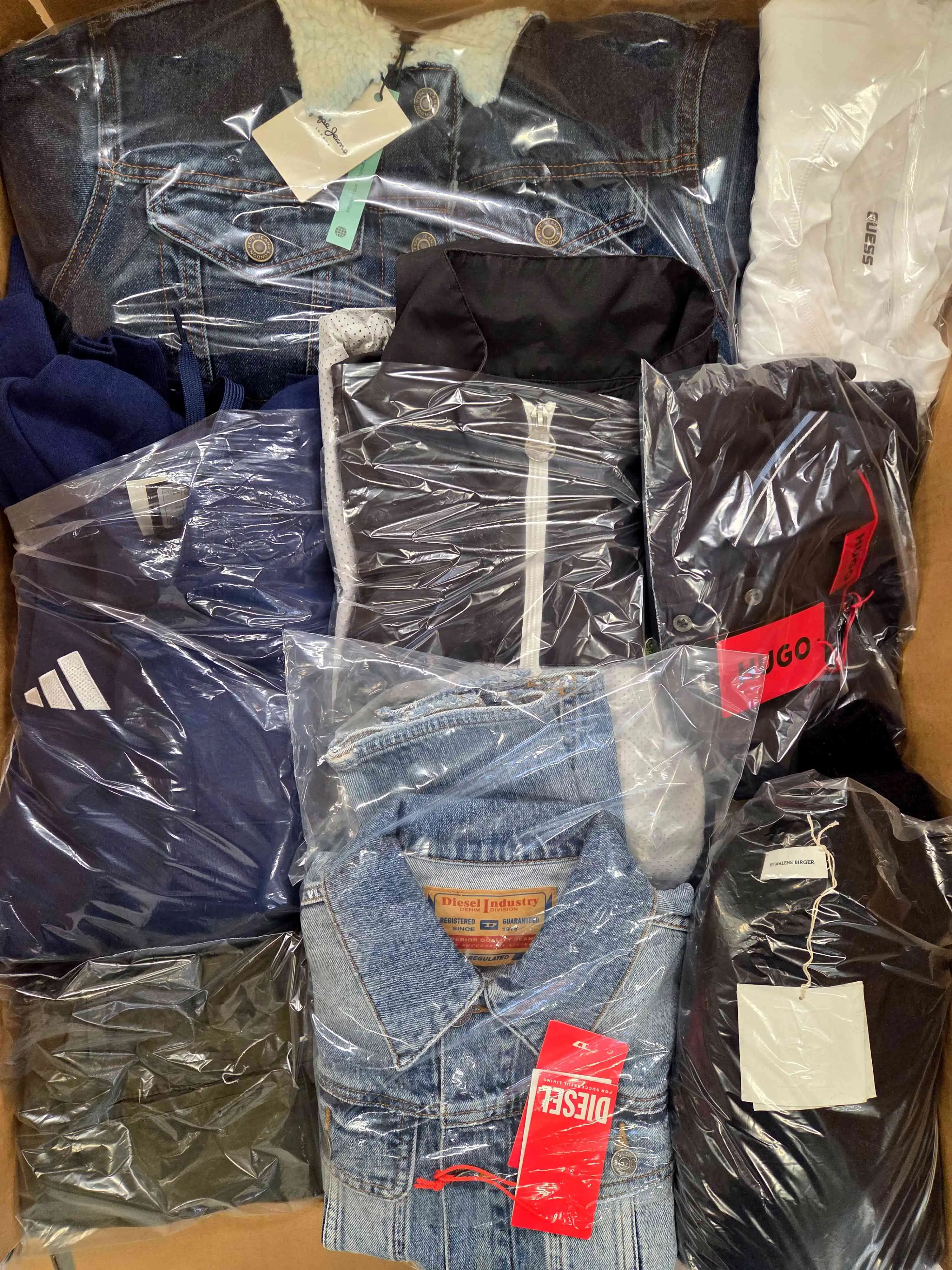 The package includes about 55 garments, and about 30% are the most recognizable brands. The package includes about 65% of women’s clothing, about 35% of men’s clothing and single units of children’s clothing. Directly from one of the largest eCommerce platforms in Europe. The top layer shown is the contents of this package and represents the top brands.