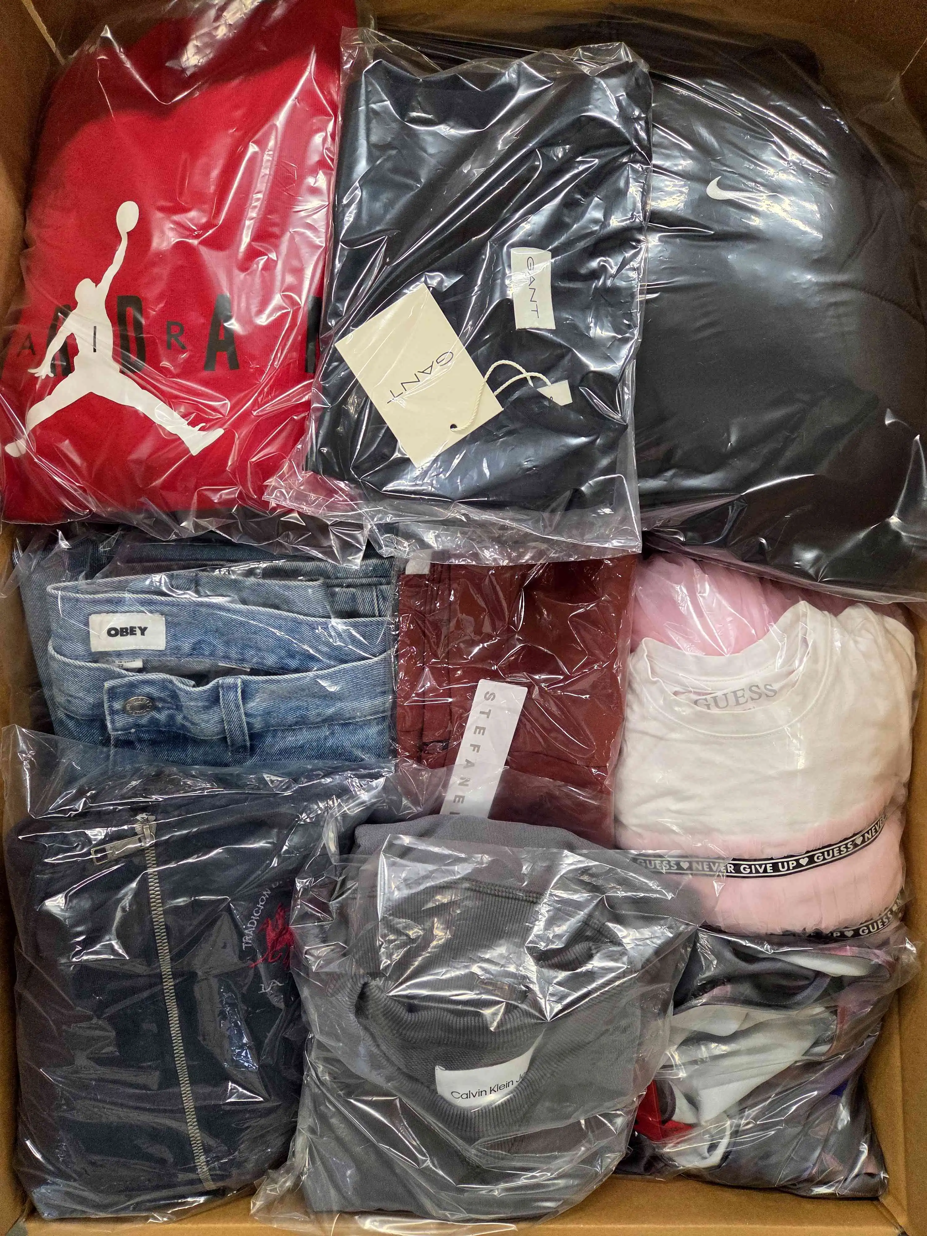 The package includes about 55 garments, and about 30% are the most recognizable brands. The package includes about 65% of women’s clothing, about 35% of men’s clothing and single units of children’s clothing. Directly from one of the largest eCommerce platforms in Europe. The top layer shown is the contents of this package and represents the top brands.