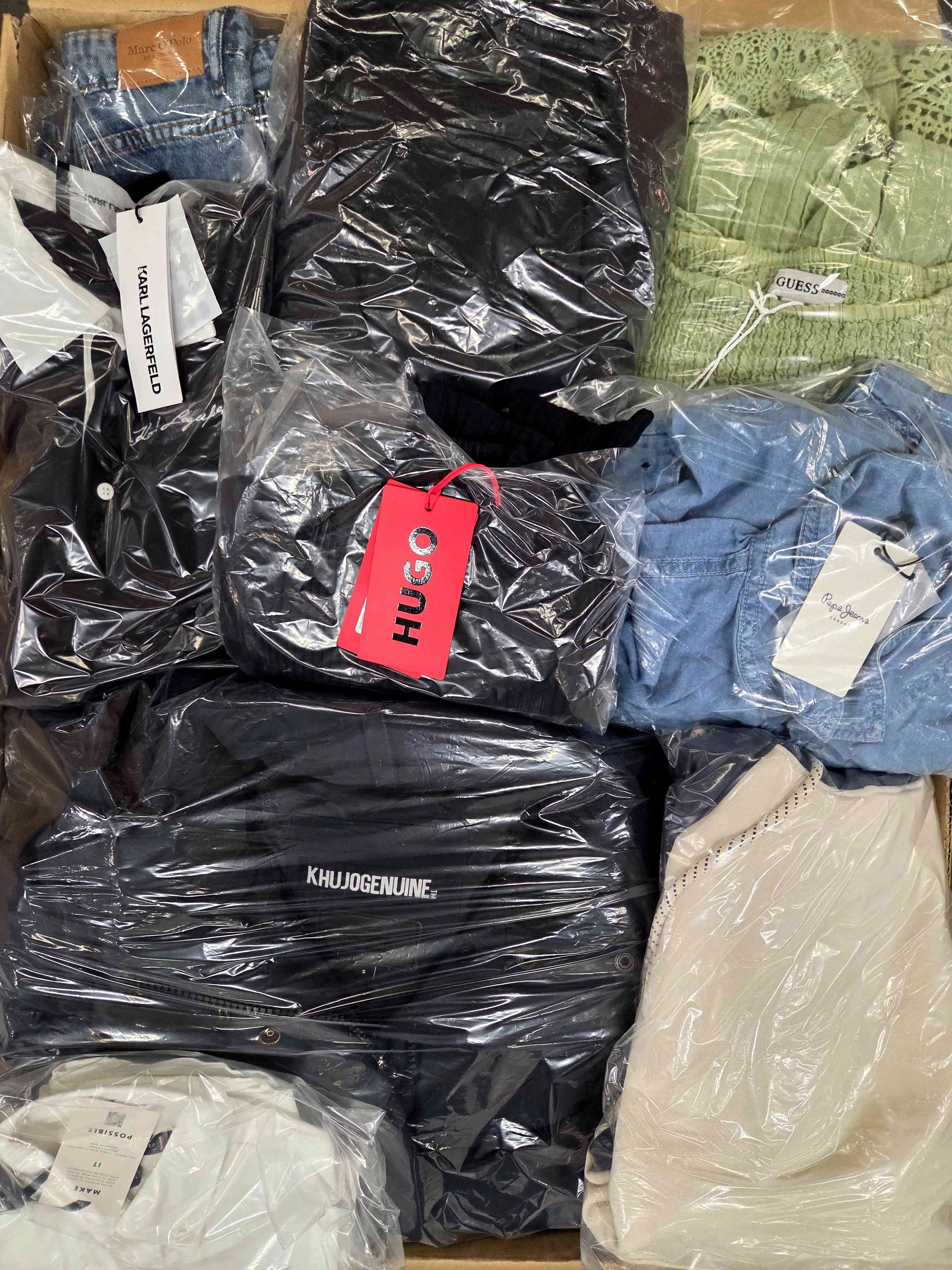 The package includes about 55 garments, and about 30% are the most recognizable brands. The package includes about 65% of women’s clothing, about 35% of men’s clothing and single units of children’s clothing. Directly from one of the largest eCommerce platforms in Europe. The top layer shown is the contents of this package and represents the top brands.