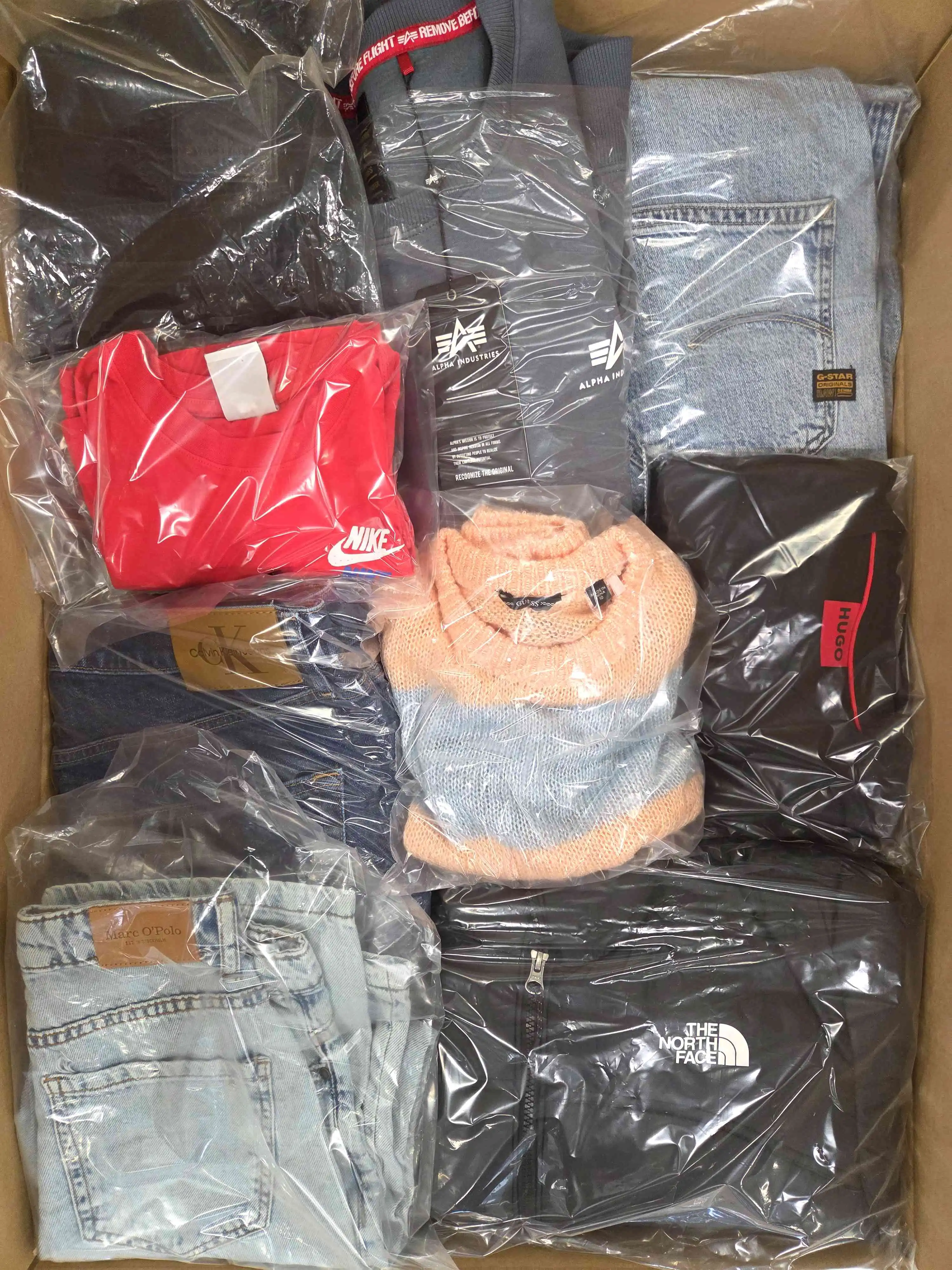 Clothing package containing a mix of brands in category C. Clothing has visible or significant signs of use or defects (discoloration, holes, jams, torn zippers, stains, missing buttons.