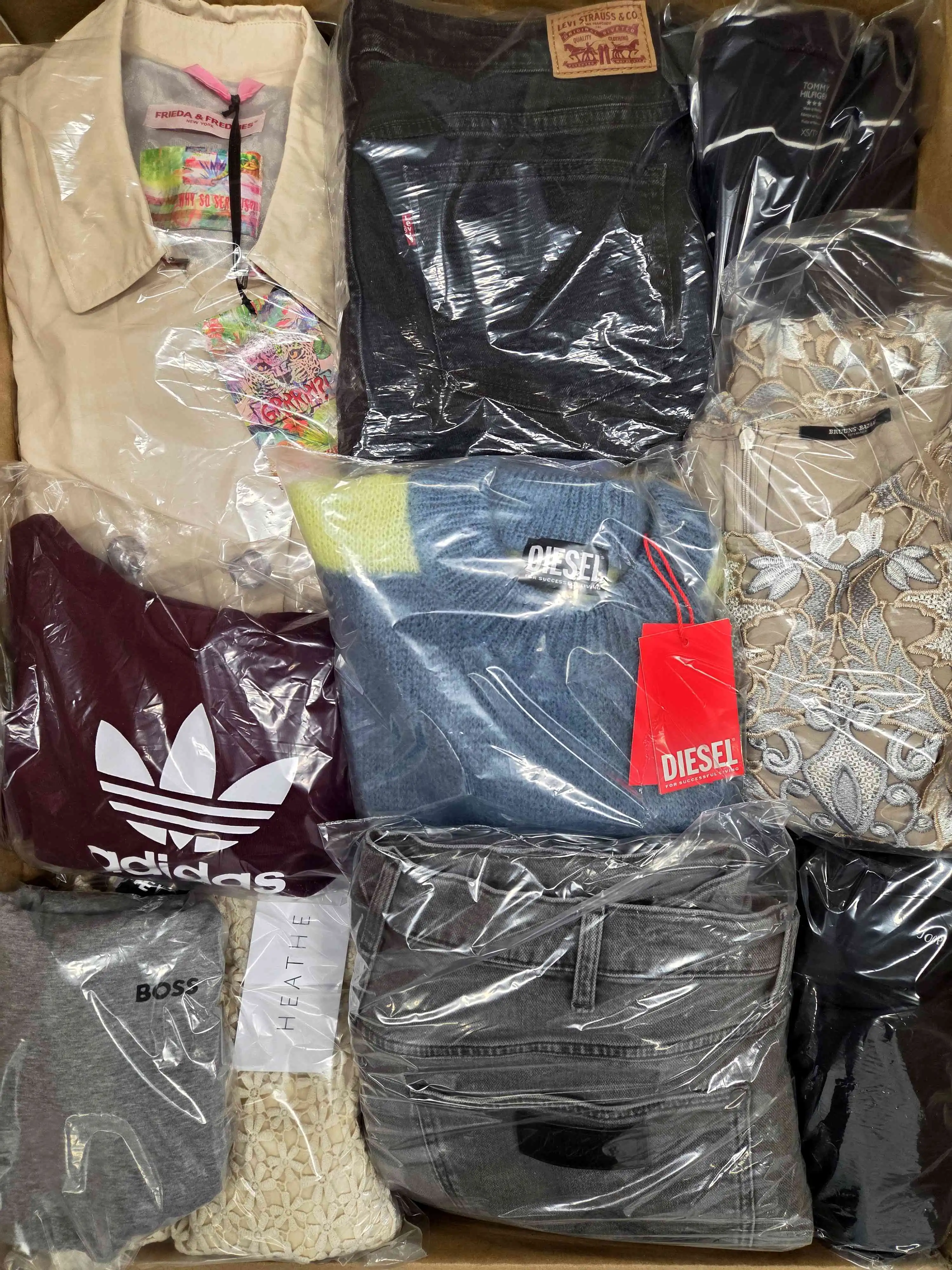 The package includes about 55 garments, and about 30% are the most recognizable brands. The package includes about 65% of women’s clothing, about 35% of men’s clothing and single units of children’s clothing. Directly from one of the largest eCommerce platforms in Europe. The top layer shown is the contents of this package and represents the top brands.