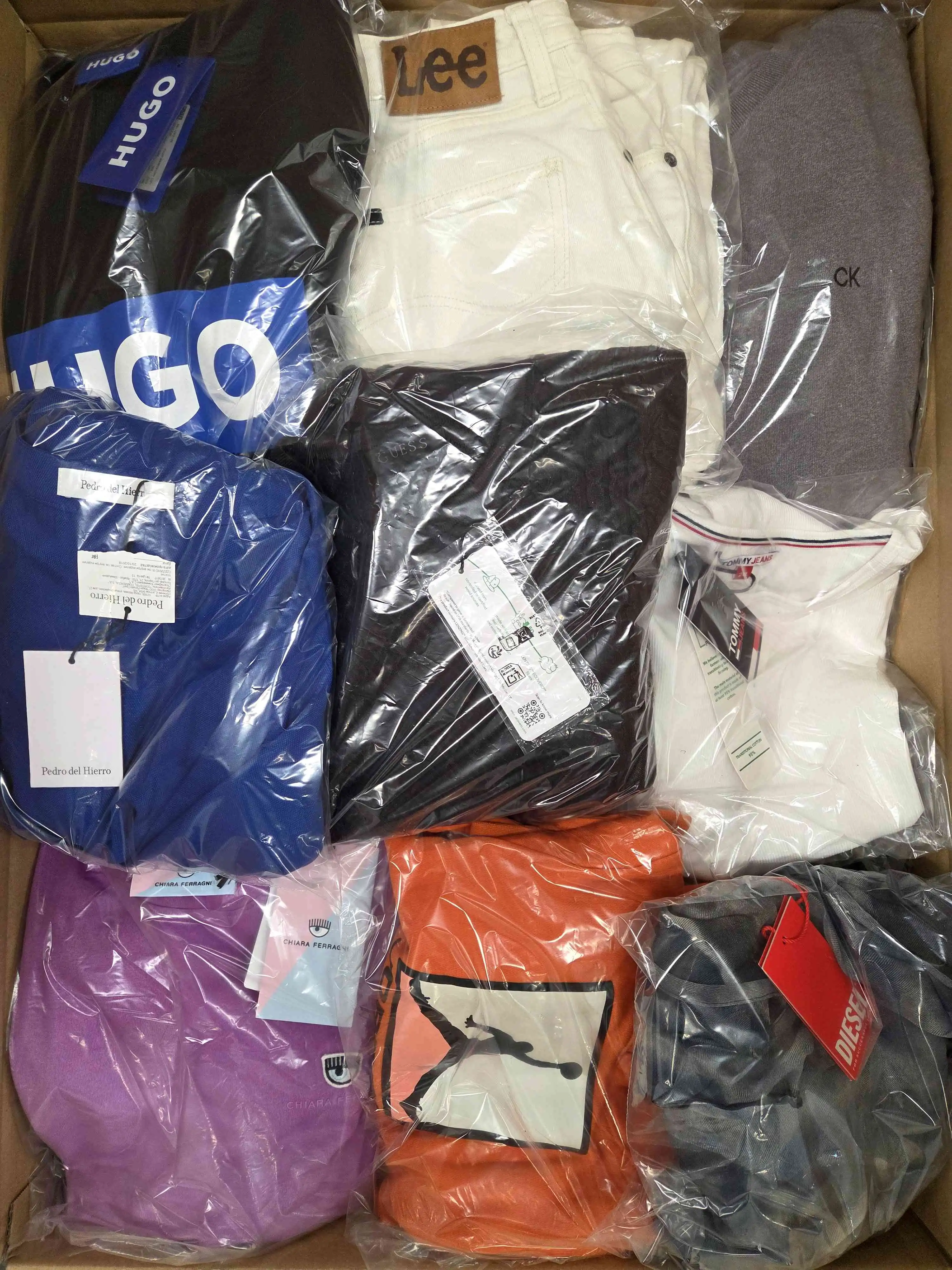 The package includes about 55 garments, and about 30% are the most recognizable brands. The package includes about 65% of women’s clothing, about 35% of men’s clothing and single units of children’s clothing. Directly from one of the largest eCommerce platforms in Europe. The top layer shown is the contents of this package and represents the top brands.
