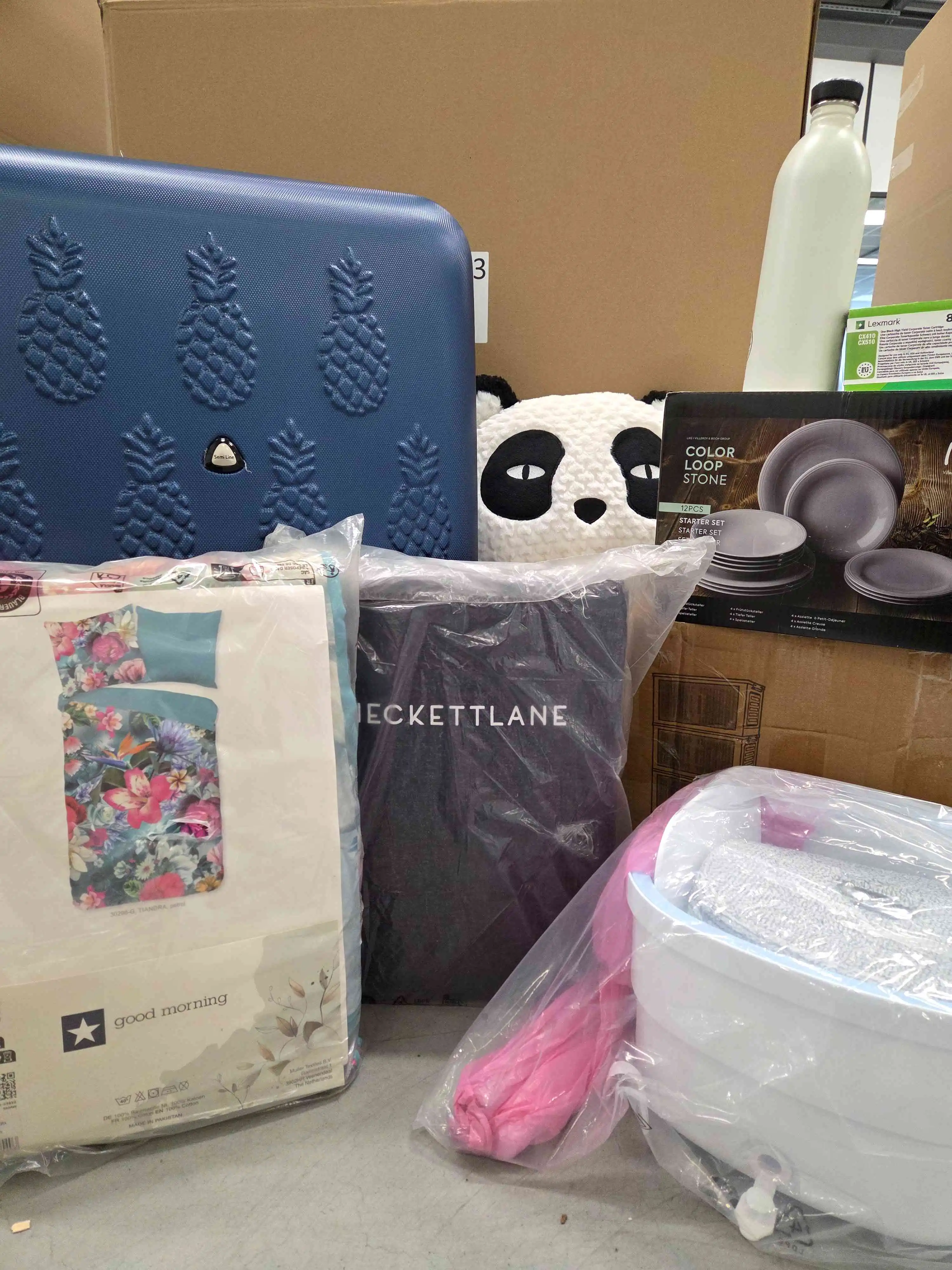 The pallet contains approx. 80 household items in category C, meaning products with visible defects. The set is dominated by textiles (around 90% of the contents), including sheets, bedding sets, as well as blankets, towels, curtains, rugs, bedspreads, and individual accessories such as bags or a suitcase.