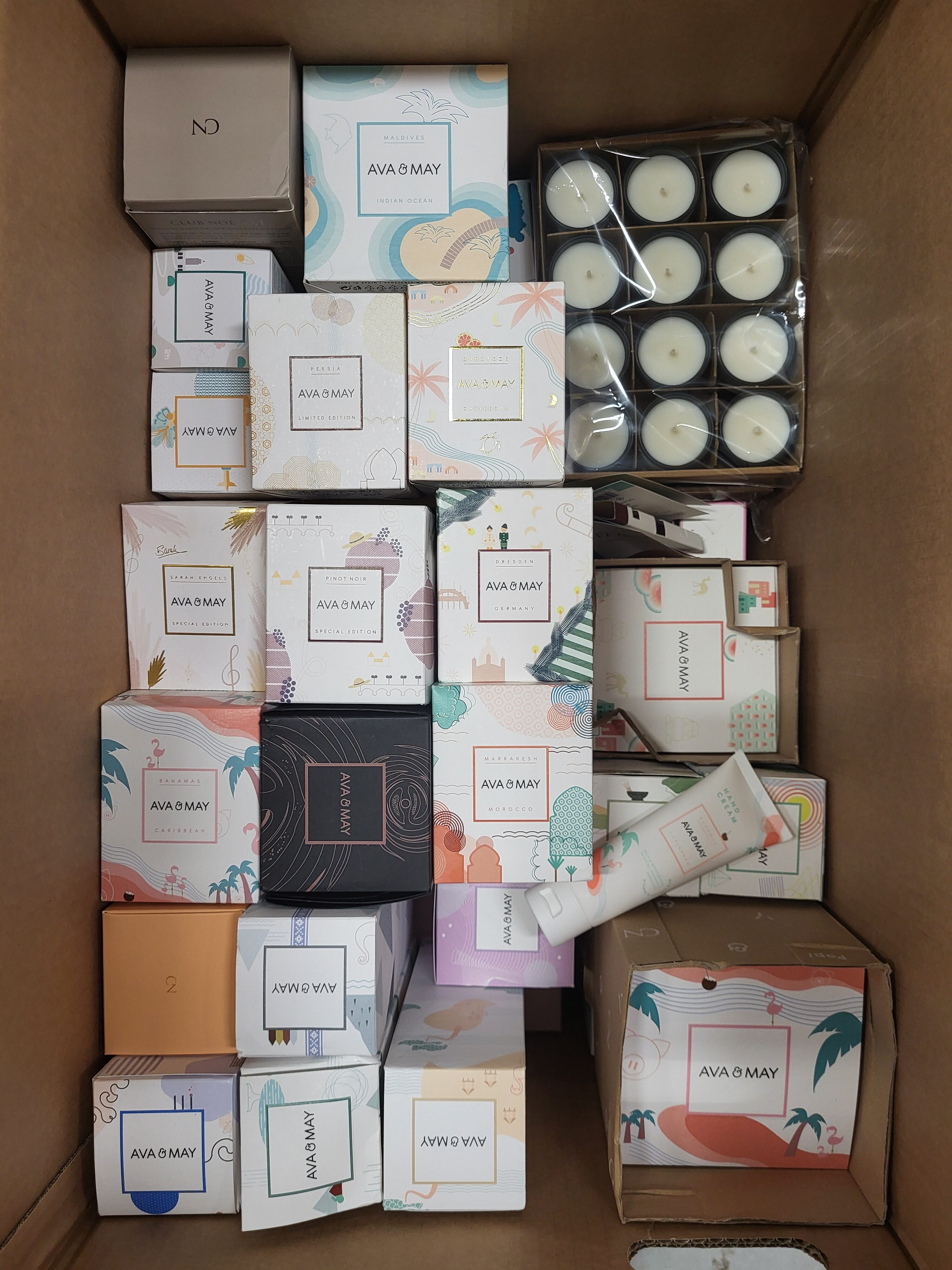 Fragrance packages from the popular foreign manufacturer Ava&May in the B/C category. The package includes, among others, candles (small, medium and large), perfumes, fragrance sticks, samples, creams, advent calendar, matches, etc.