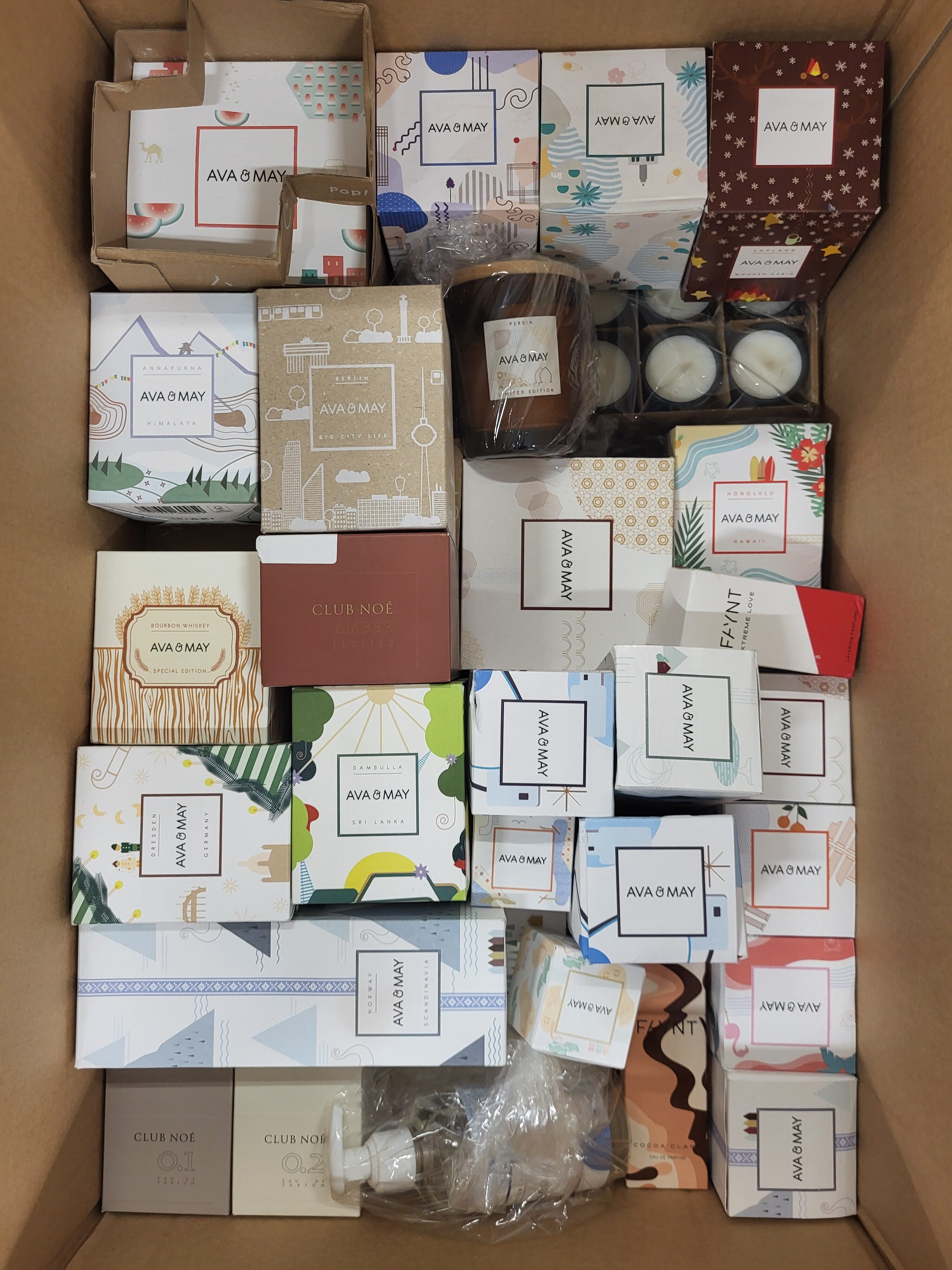 Fragrance packages from the popular foreign manufacturer Ava&May in the B/C category. The package includes, among others, candles (small, medium and large), perfumes, fragrance sticks, samples, creams, advent calendar, matches, etc.